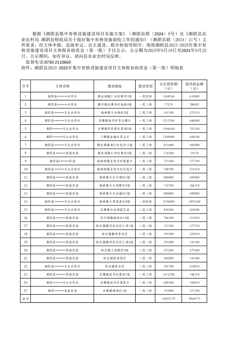 湘阴县2023-2025年集中育秧设施建设项目主体拟补助资金(第一批)公示