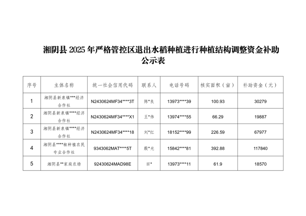 湘阴县2025年严格管控区退出水稻种植进行种植结构调整资金补助情况公示