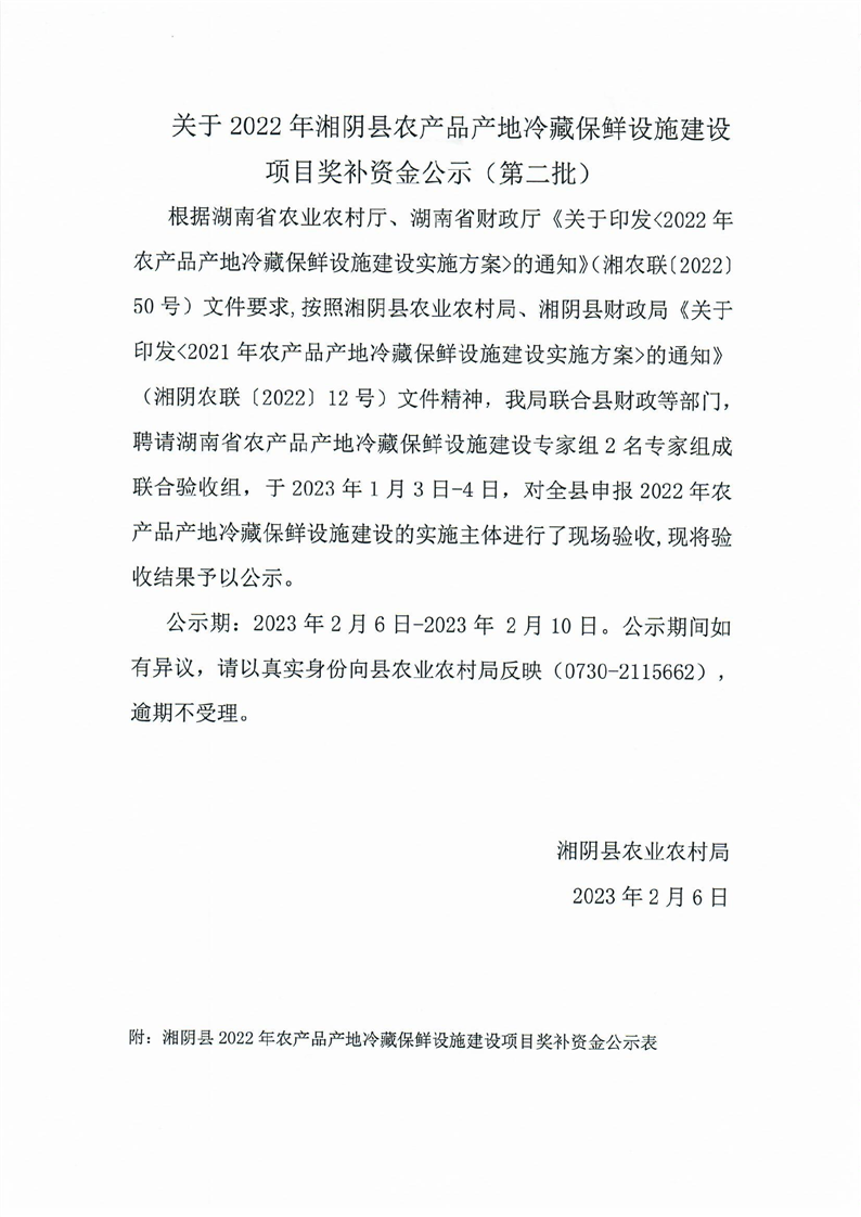 关于2022年湘阴县农产品产地冷藏保鲜设施建设项目奖补资金公示(第二批)