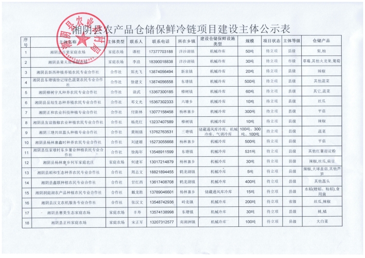 湘阴县2020年度农产品仓储保鲜冷链项目实施主体公示