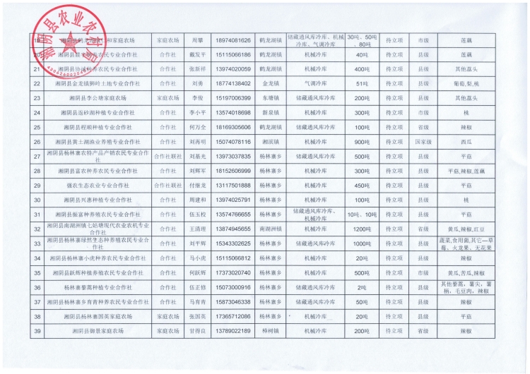 根据《省农业厅省财政厅关于加快农产品仓储保鲜冷链设施建设的实施方案》湘) ) 农联﹝2020﹞80号文件要求,提高我县农产品仓储保鲜冷链设施水平,从源头上加快解决我县农产品出村进城“最初一公里”问题,以水果蔬菜产业为重点,根据自愿申请、乡镇推荐、现场考察认定以下39家示范家庭农场和示范合作社拟实施农产品仓储保鲜冷链项目,现予以公示(名单附后)。 公示期为7天(2020年10月21日至10月27日),有关单位和个人如对公示内容有异议,请通过来信来电来访等形式向湘阴县农业农村局(联系电话0730-2115662)反映。 湘阴县农业农村局 2020年10月21日 |