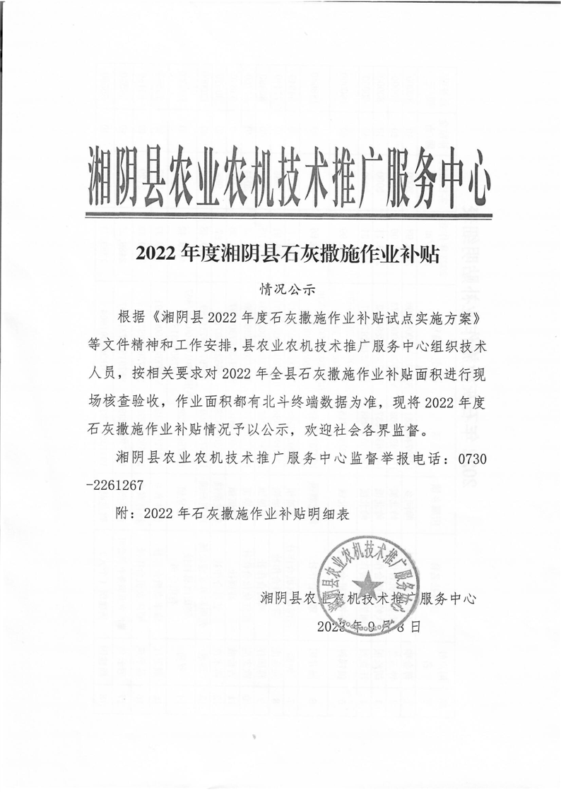 2022年度湘阴县石灰撒施作业补贴情况公示