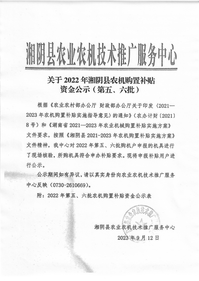 关于2022年湘阴县农机购置补贴资金公示(第五、六批)