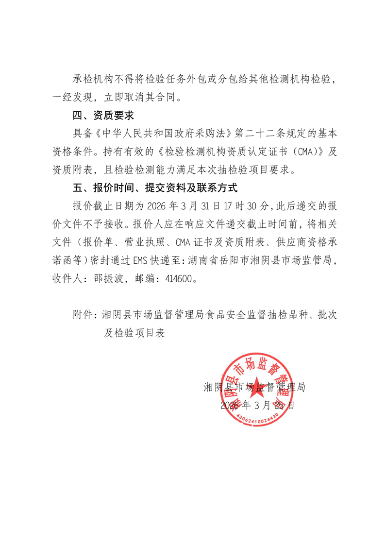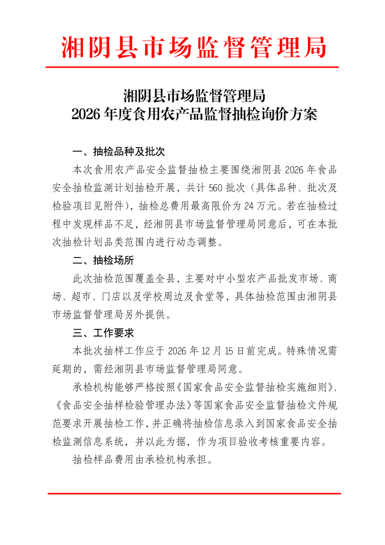 湘阴县市场监督管理局2026年度食用农产品监督抽检询价方案