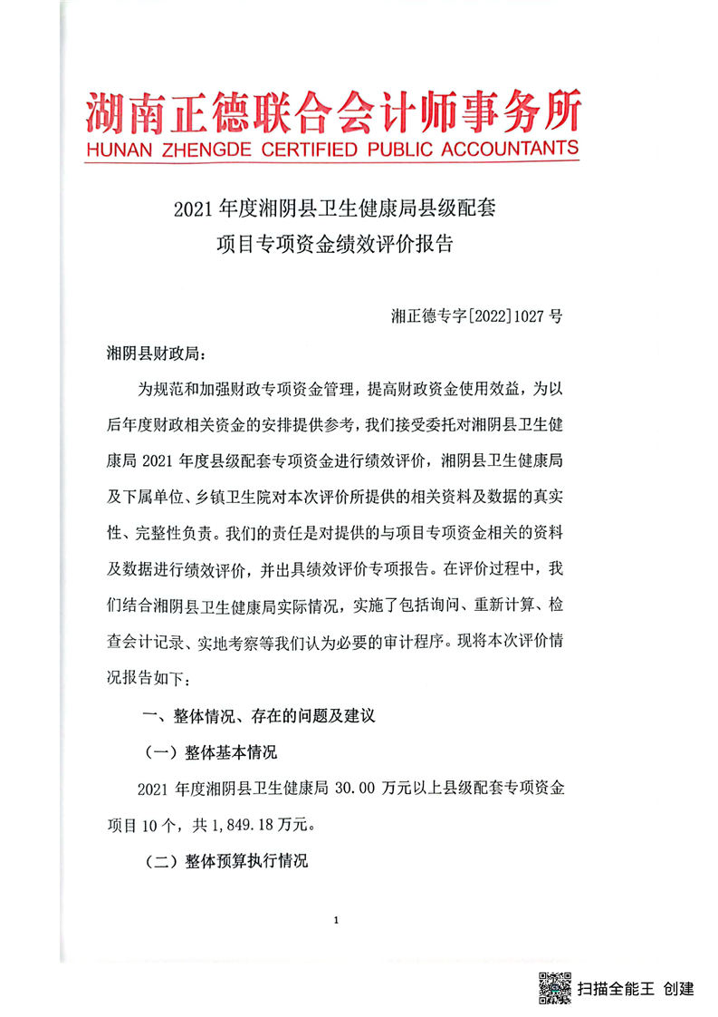 2021年度湘阴县卫生健康局县级配套项目专项资金绩效评价报告