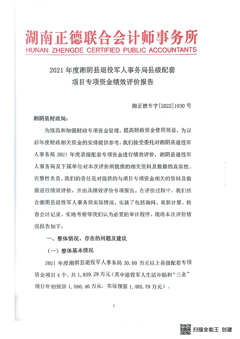 2021年度湘阴县退役军人事务局县级配套项目专项资金绩效评价报告