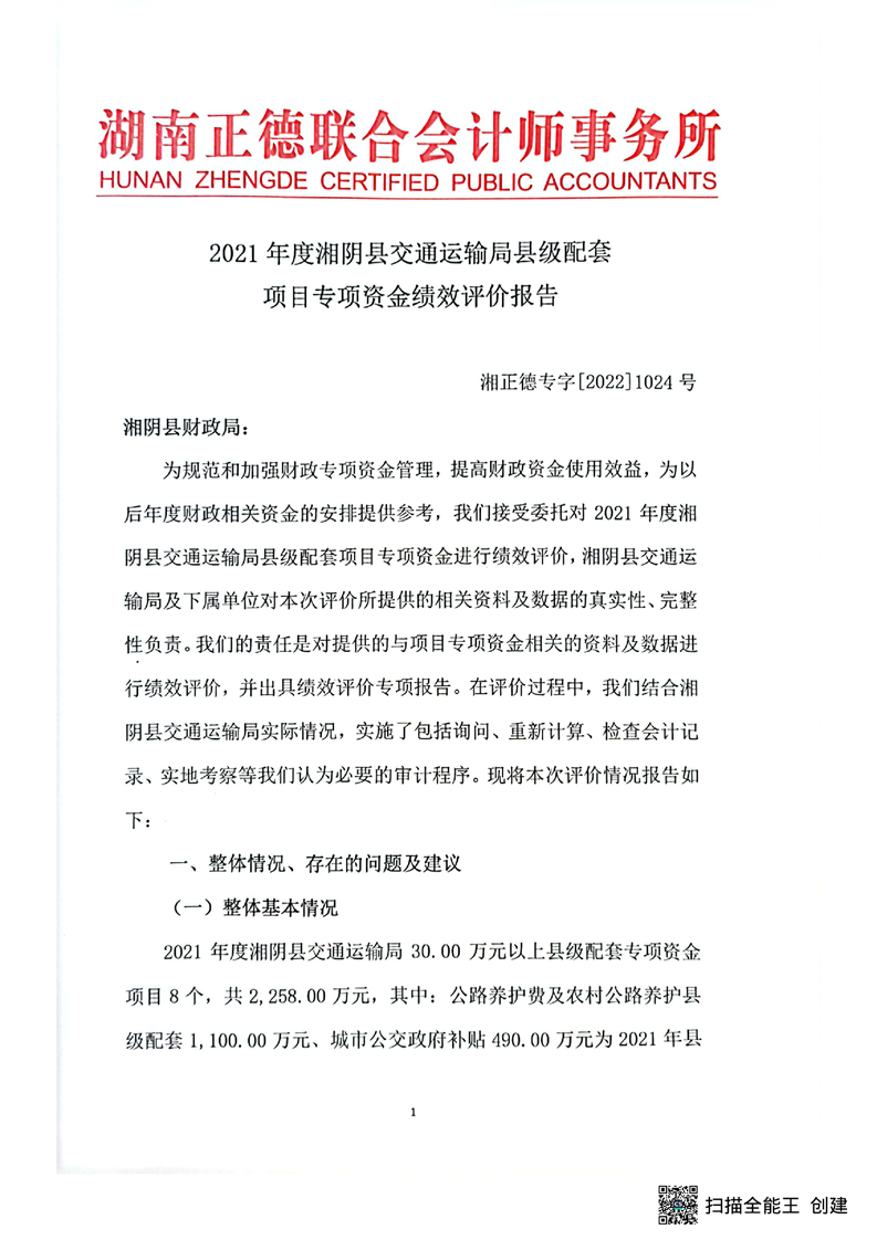 2021年度湘阴县交通运输局县级配套项目专项资金绩效评价报告