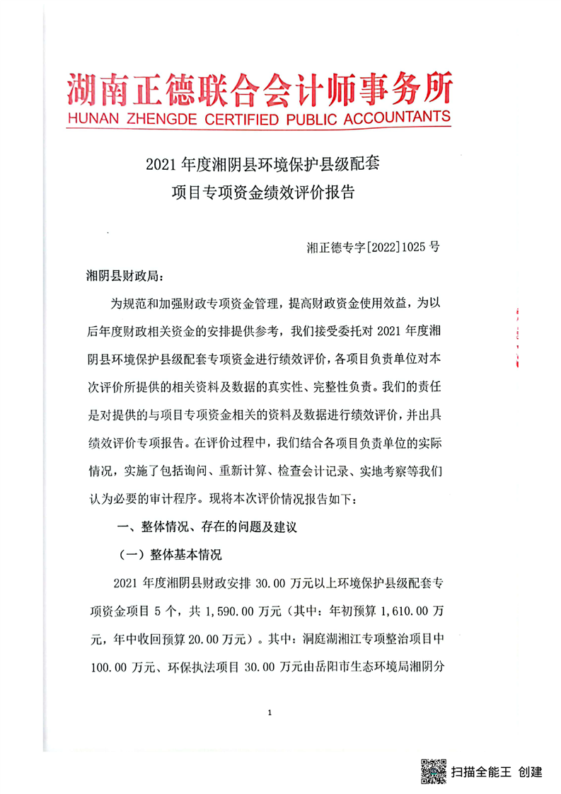 2021年度湘阴县环境保护县级配套项目专项资金绩效评价报告