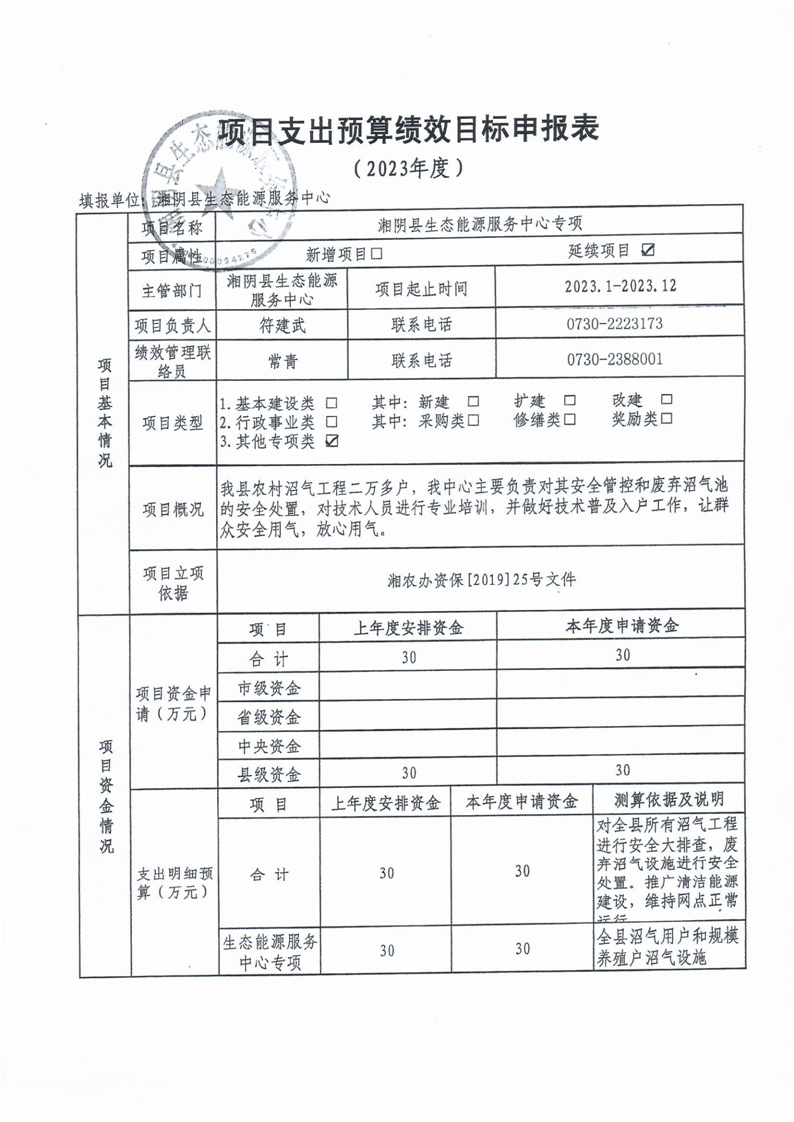 2023年度-湘阴县生态能源服务中心-项目支出预算绩效目标申请表