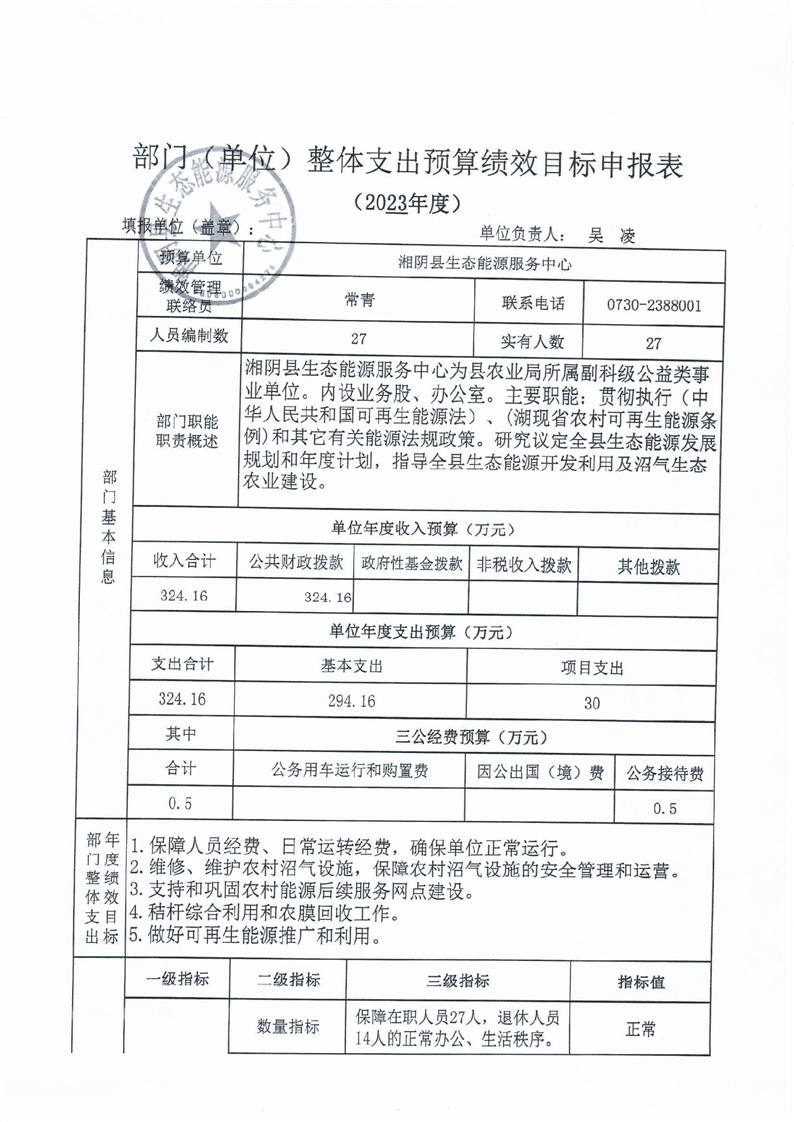 2023年度-湘阴县生态能源服务中心-整体支出预算绩效目标申报表