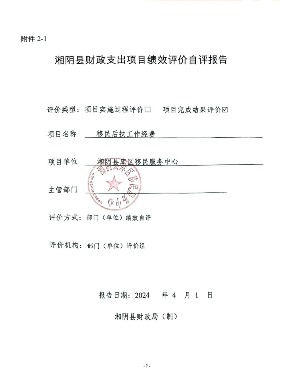 2023年-湘阴县库区移民服务中心-财政预算资金绩效自评公开