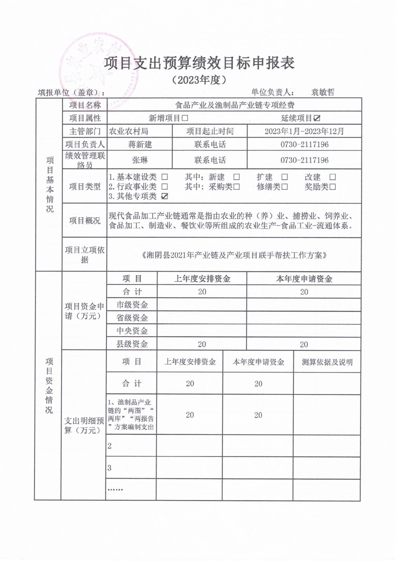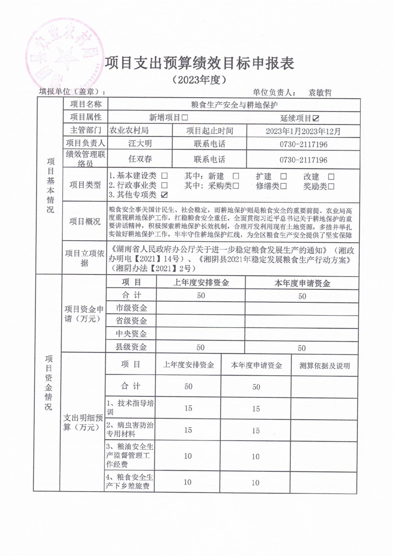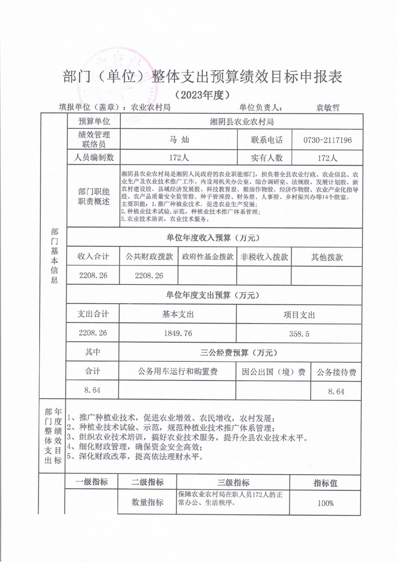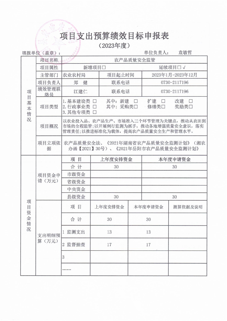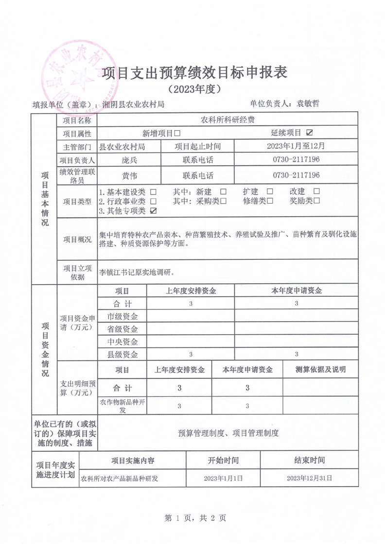 2023年度湘阴县农业农村局预算绩效目标信息公开