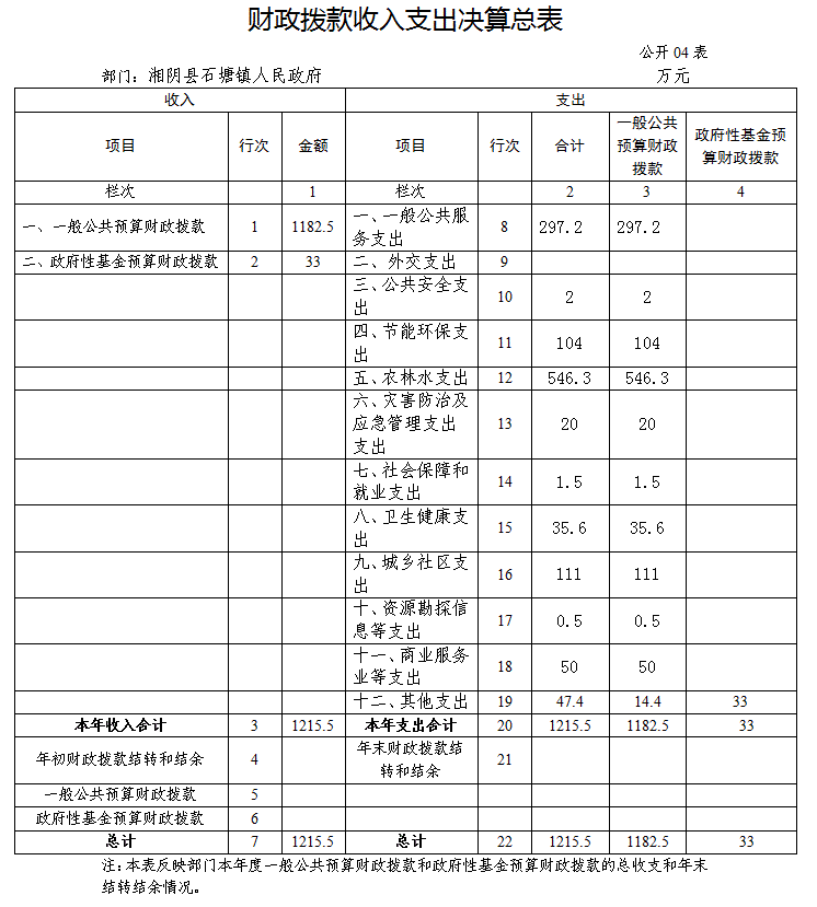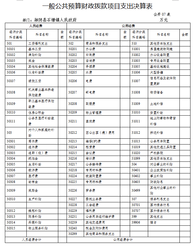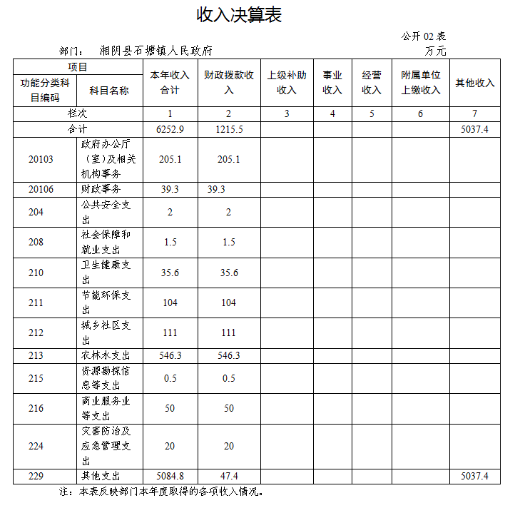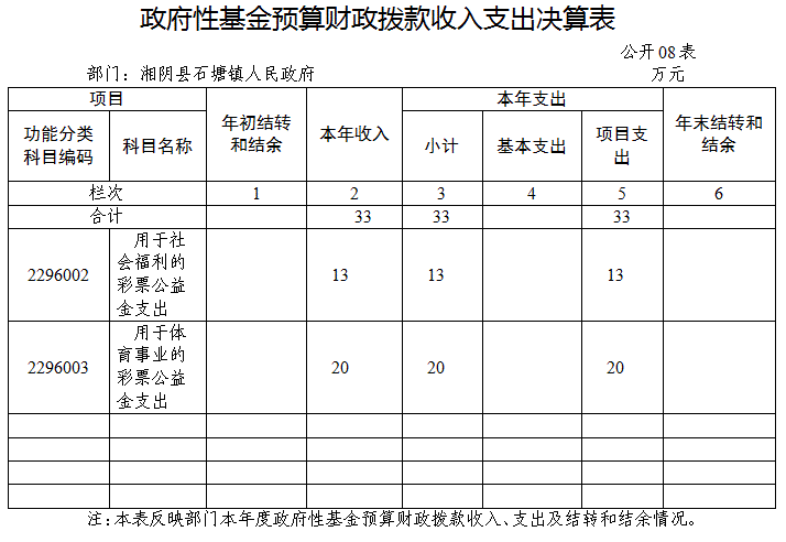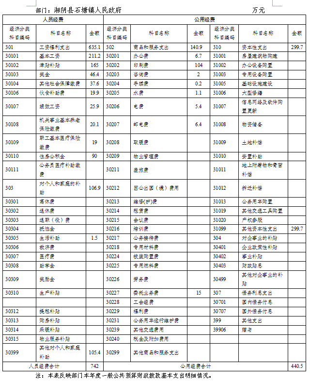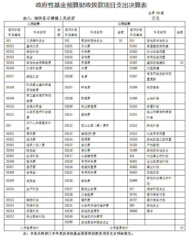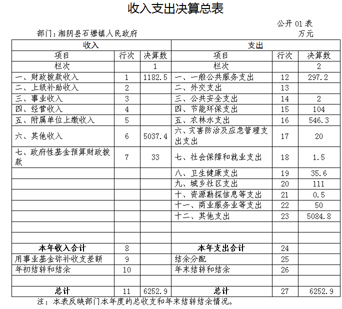 目录 第一部分 湘阴县石塘镇人民政府概况 一、部门职责 二、机构设置 第二部分 湘阴县石塘镇人民政府2019年度部门决算表 一、收入支出决算总表 二、收入决算表 三、支出决算表 四、财政拨款收入支出决算总体情况说明 五、一般公共预算财政拨款支出决算表 六、一般公共预算财政拨款基本支出决算表 七、一般公共预算财政拨款项目支出决算表 七、一般公共预算财政拨款“三公”经费支出决算表 八、政府性基金预算财政拨款收入支出决算表 九、政府性基金预算财政拨款项目支出决算表 第三部分 湘阴县石塘镇人民政府2019年度部门决算情况说明 一、收入支出决算总体情况说明 二、收入决算情况说明 三、支出决算情况说明 四、财政拨款收入支出决算总体情况说明 五、一般公共预算财政拨款支出决算情况说明 六、一般公共预算财政拨款支出决算情况说明 七、政府性基金预算收入支出决算情况 八、关于2019年度预算绩效情况说明 九、其他重要事项的情况说明 第四部分名称解释 第一部分 湘阴县石塘镇人民政府概况 一、部门职责 石塘镇毗邻县城东北,东与六塘乡和汨罗市紧邻,南临洋沙湖街道,西临湘江,北靠三塘镇、东塘镇,是湘阴县城的东北门户。辖10个村、2个社区,总人口约4.3万,总面积约93.4平方公里,其中耕地4.3万亩、山地3.8万亩。石塘镇人民政府贯彻执行党和国家的路线、方针、政策、法律法规和上级国家行政机关发布的命令、决定,执行本区域的经济和社会发展计划、预算,负责本区域农业、工业、旅游、林业、环保、水利、科技、教育、文化、卫生、计划生育、体育、民政、安全生产、村镇建设、劳动保障和社会稳定等社会管理和公共服务;推进社会主义新农村建设,营造社会经济发展环境,保护国有资产、集体财产,维护各种经济组织及公民的合法权益。 二、机构设置 石塘镇人民政府有在职人员70人,32个行政编制,38个事业编制。 第二部分 湘阴县石塘镇人民政府2019年度部门决算表(见附表)
