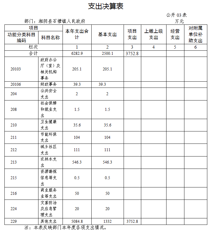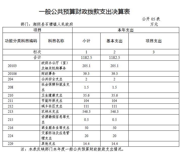 第三部分 湘阴县石塘镇人民政府2019年度部门决算情况 说明 一、收入支出决算总体情况说明 2019年收入总计6252.9万元,支出总计6252.9万元,年末无结余。 二、收入决算情况说明 2019年收入决算6252.9万元,收入分别来源于公共财政拨款和其他收入,其中一般公共财政预算1182.5万元,政府性基金预算财政拨款收入33万元,其他收入5037.4万元。 三、支出决算情况说明 2019年财政拨款支出决算6252.9万元,主要支出具体为:①行政运行经费支出2500.1万元。主要用于系统保障单位正常运转,完成日常工作任务而发生的各项支出,包括用于职工工资、津补贴等人员经费以及办公费、印刷费、邮电费、物业管理费、差旅费、交通费、培训费、办公设备购置等日常公用经费。 ②专项支出3752.8万元。主要用于防汛救灾、河湖治理、矮围整治、旅游开发、美化绿化等。 四、财政拨款收入支出决算总体情况说明 2019年财政拨款收入总计1182.5万元,较2018年1088.3万元,增加94.2万元;财政拨款支出总计1182.5万元,较2018年1088.3万元,增加94.2万元;年末无结余。 五、一般公共预算财政拨款支出决算情况说明 (一)财政拨款支出决算总体情况。 2019年一般公共预算财政拨款支出共计1182.5万元,占本年总支出比重18.9%。 (二)财政拨款支出决算结构情况。 2019年财政预算拨款支出共计1182.5万元,其中政府办公厅(室)及相关机构事务205.1万元,占比17.3%;财政事务支出39.3万元,占比3.3%;公共安全支出2万元,占比0.2%;社会保障和就业支出1.5万元,占比1.3%;卫生健康支出35.6万元,占比3%,节能环保支出104万元,占比8.8%;城乡社区支出111万元,占比9.4%;农林水支出546.3万元,占比46.2%;商业服务业等支出50万元,占比4.2%;灾害防治及应急管理支出20万元,占比1.7%;其他支出14.4万元,占比1.2%。 六、一般公共预算财政拨款支出决算情况说明 2019年一般公共预算财政拨款支出为1182.5万元,其中人员经费742万元,占比62.7%;公用经费440.5万元,占比37.3%。 七、一般公共预算财政拨款“三公”经费支出决算情况说明 “三公”经费财政拨款支出决算总体情况说明。 2019年“三公”经费支出无,主要为单位厉行节约。 八、政府性基金预算收入支出决算情况 2019年政府性基金预算财政拨款支出共计33万元,占本年总支出比重1%, 九、关于2019年度预算绩效情况说明 今年来,我镇党委政府认真完成了本镇的日常管理工作,认真贯彻执行党和国家的路线、方针、政策、法律法规和上级国家行政机关发布的命令、决定,执行本区域的经济和社会发展计划、预算,实现了“保民生支出、保重点工程、保工资福利、保收支平衡”的总体目标。 十、其他重要事项 政府采购支出情况。本部门2019年度政府采购支出总额50万元,其中:政府采购货物支出15万元、政府采购工程支出0万元、政府采购服务支出35万元。 (三)国有资产占用情况。截至2019年12月31日,本部门无公务用车,无单位价值50 万元以上通用设备。 第四部分名词解释 1、机关运行经费:是指各部门的公用经费,包括办公及印刷费、邮电费、差旅费、会议费、福利费、日常维修费、专用资料及一般设备购置费、办公用房水电费、办公用房取暖费、办公用房物业管理费、公务用车运行维护费以及其他费用。 2、“三公”经费:纳入省财政预算管理的“三公“经费,是指用一般公共预算拨款安排的公务接待费、公务用车购置及运行维护费和因公出国(境)费。其中,公务接待费反映单位按规定开支的各类公务接待支出;公务用车购置及运行费反映单位公务用车车辆购置支出(含车辆购置税),以及燃料费、维修费、保险费等支出;因公出国(境)费反映单位公务出国(境)的国际旅费、国外城市间交通费、食宿费等支出。 |