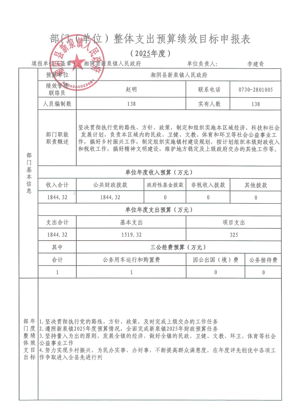 2025年-湘阴县新泉镇人民政府-财政预算资金绩效公开