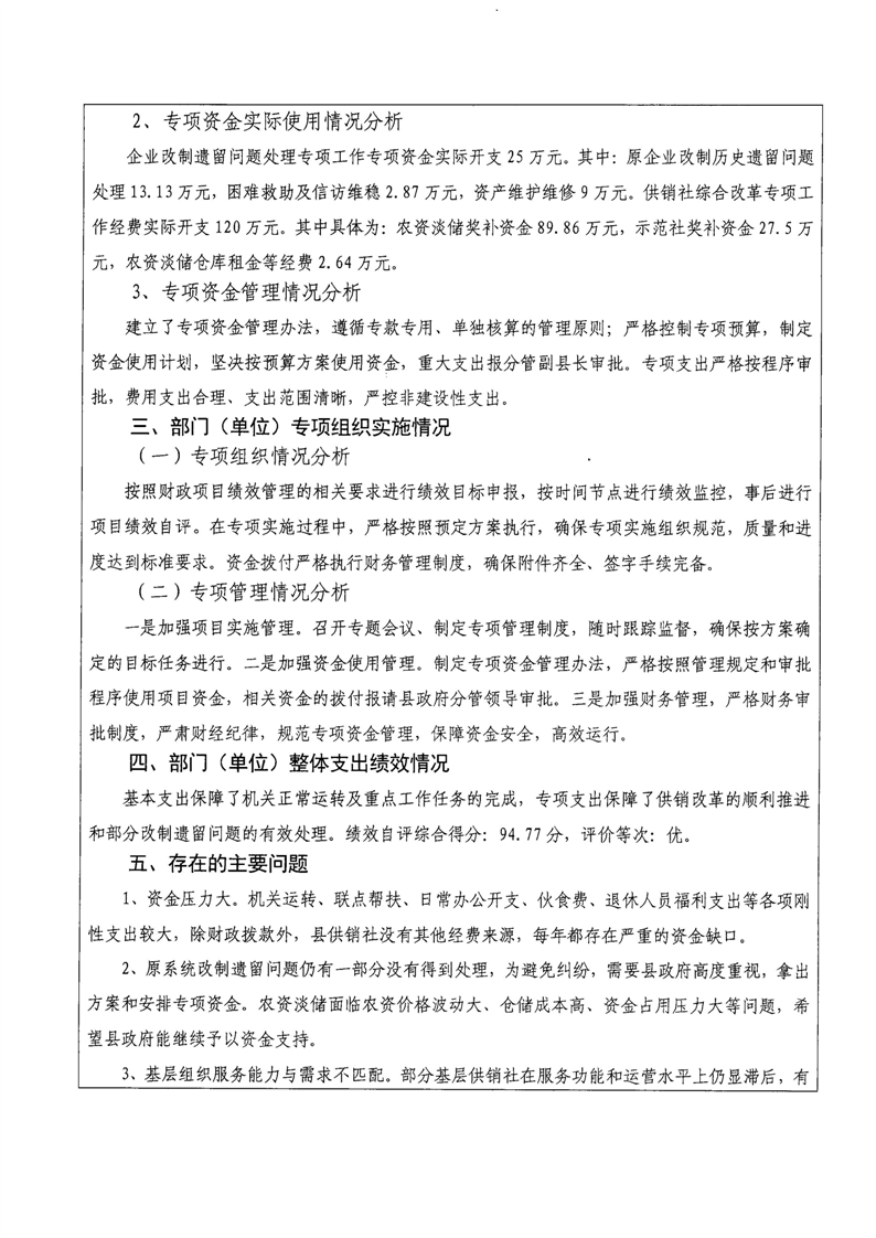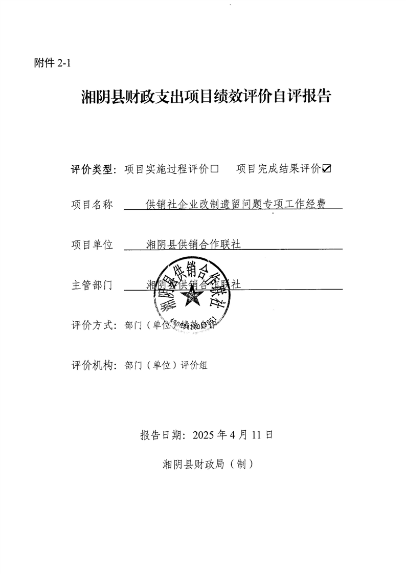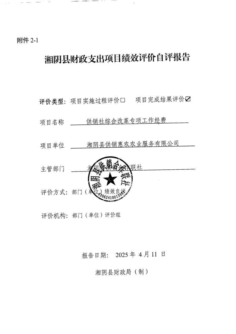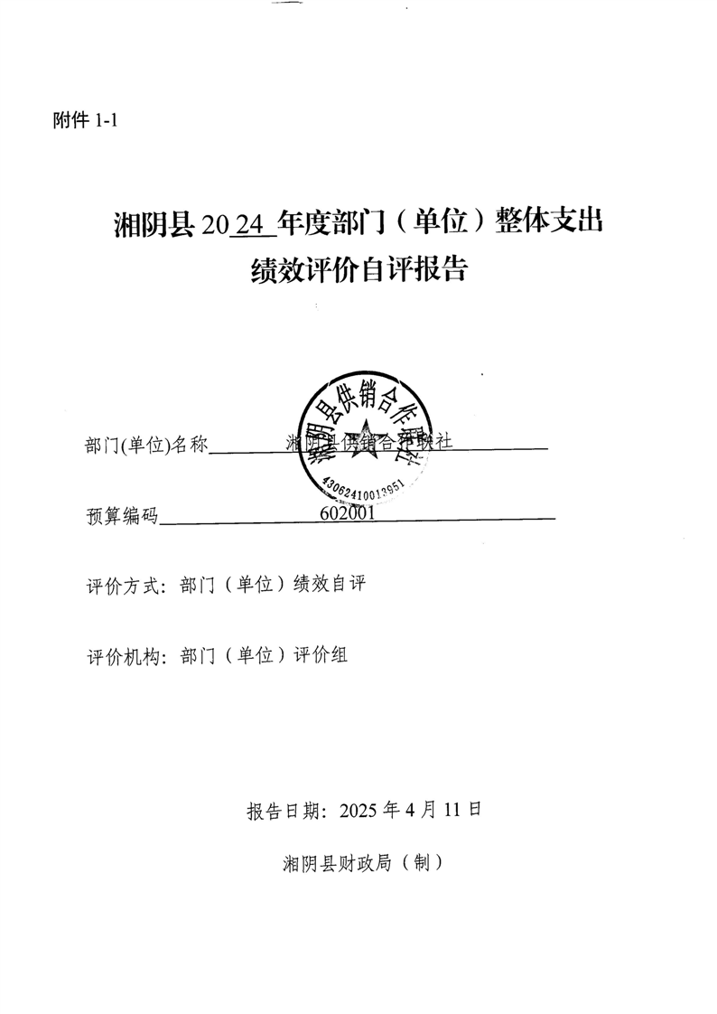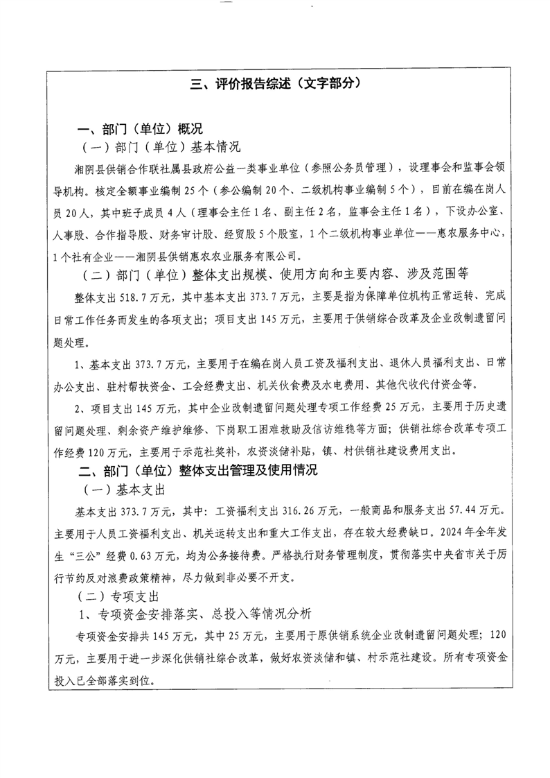 湘阴县供销合作联社2024年整体支出及项目支出绩效自评报告