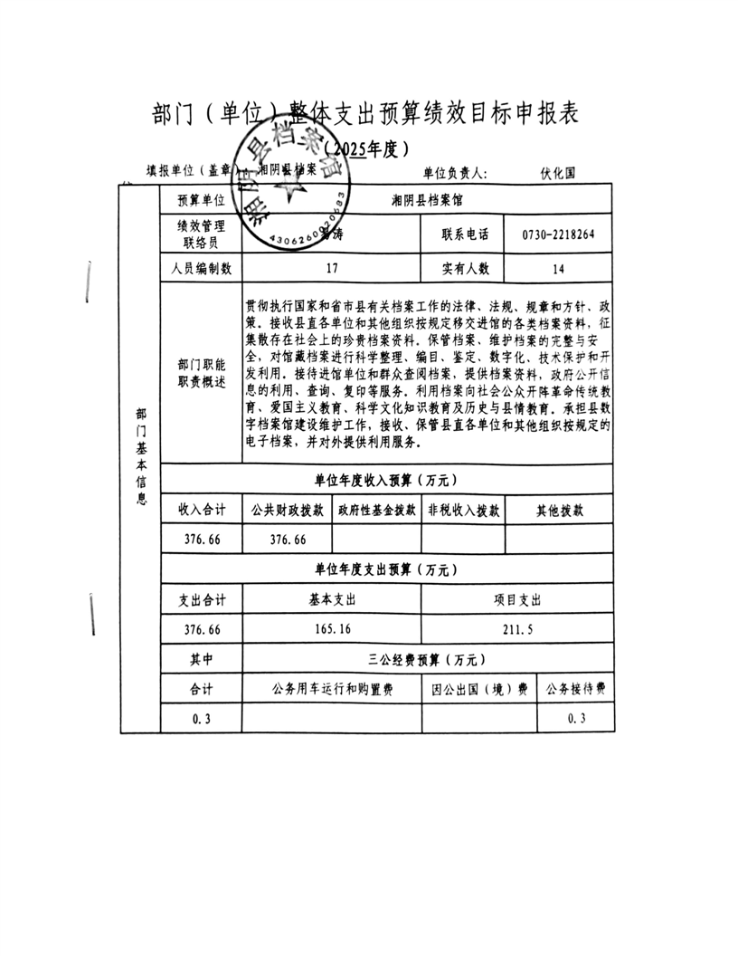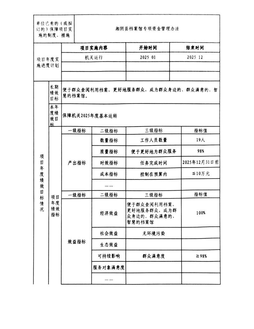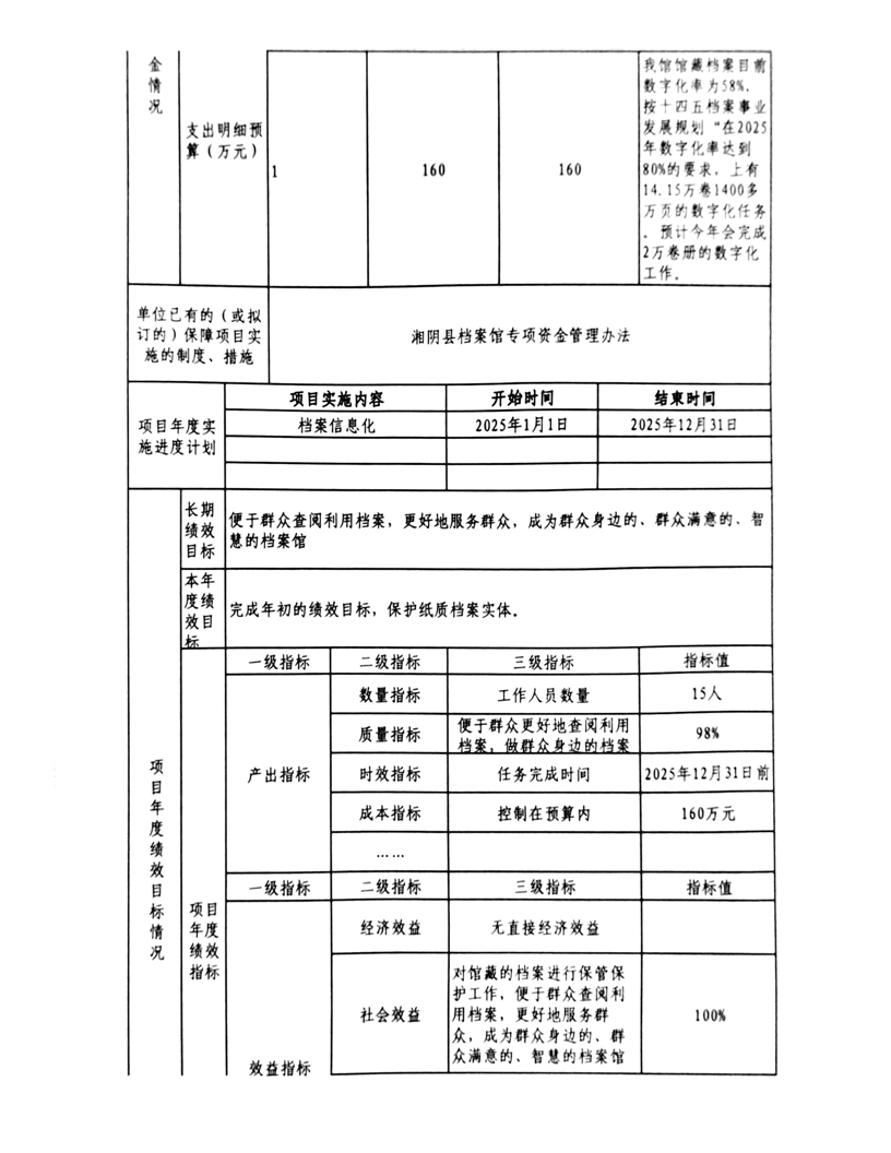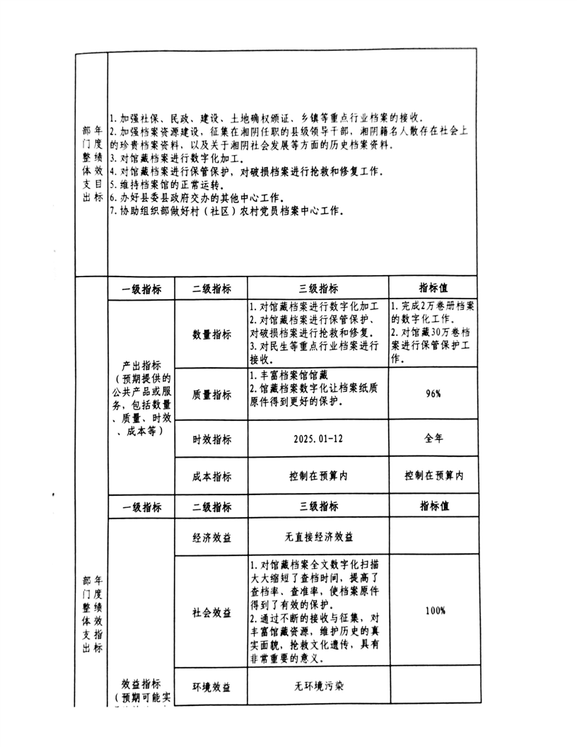 2025年-湘阴县档案馆-整体、项目支出预算绩效目标申报表