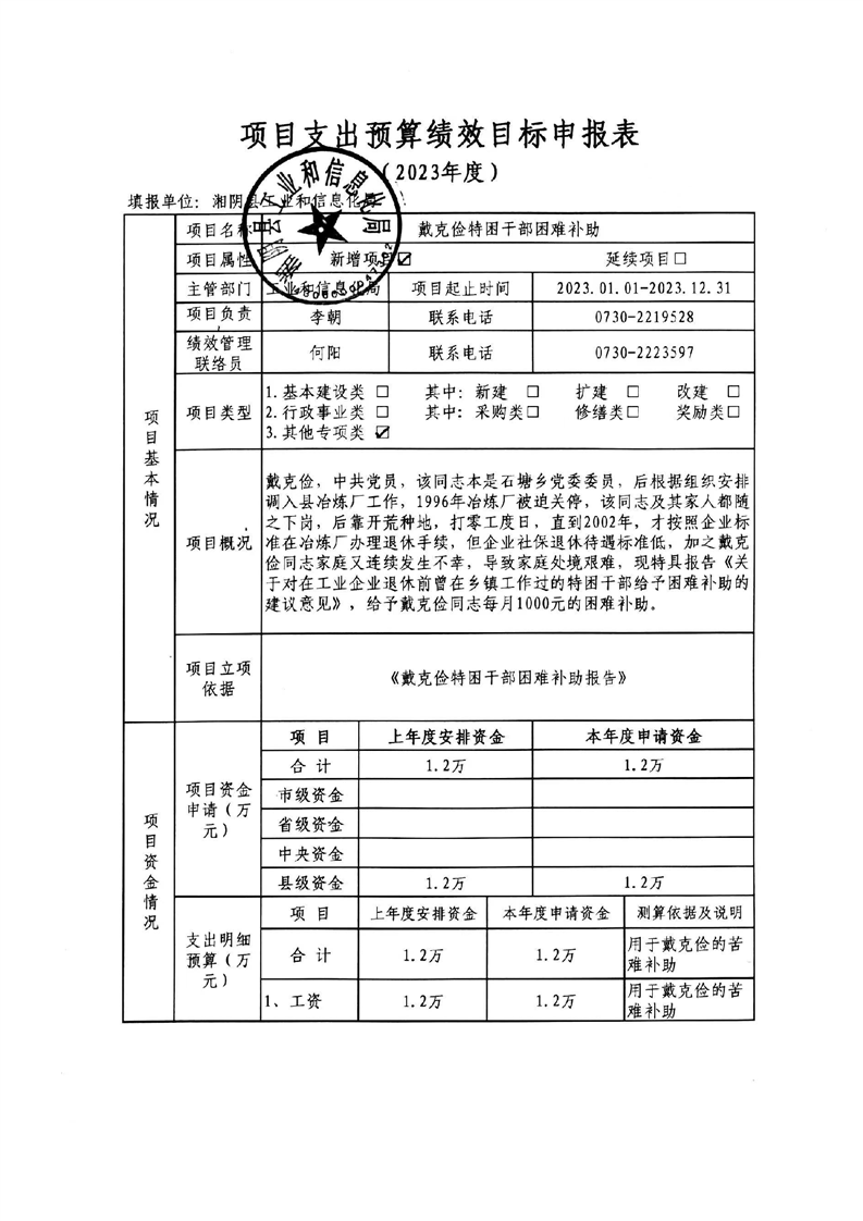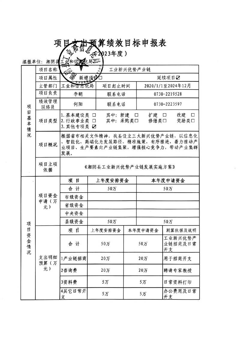 2023年度-湘阴县工信局-项目支出预算绩效目标申报表