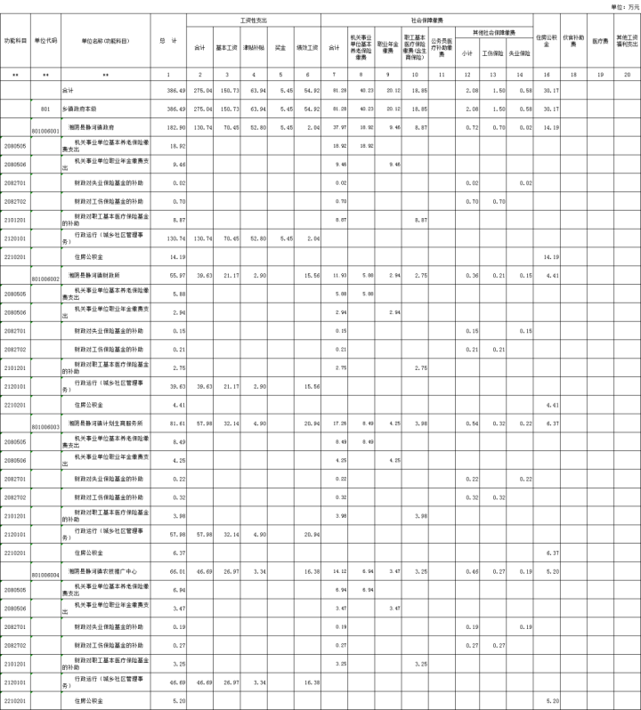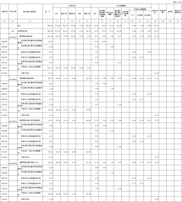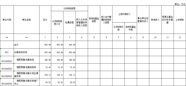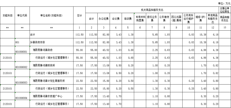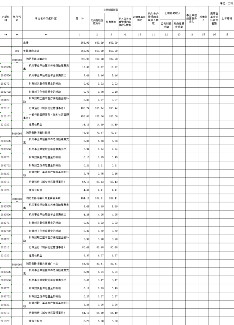 湘阴县静河镇人民政府2021年度部门预算 目录 第一部分 湘阴县静河镇人民政府2021年部门预算说明 一、部门基本概况 (一)职能职责 二、部门预算单位构成 三、部门收支总体情况 (一)收入预算 (二)支出预算 四、一般公共预算拨款支出预算 (一)基本支出 (二)项目支出 五、政府性基金预算支出 六、其他重要事项的情况说明 (一)机关运行经费 (二)“三公”经费预算 (三)一般性支出情况 (四)政府采购情况 (五)国有资产占有使用及新增资产配置情况 (六)重点项目预算的绩效目标等预算绩效情况说明 六、名词解释 第二部分 部门预算公开表格 一、部门收支总表 二、部门收入总表 三、部门支出总表 四、部门支出总表(分类) 五、部门支出总表(按政府预算经济分类) 六、工资福利支出预算表 七、工资福利支出(按政府预算经济分类) 八、一般商品和服务支出预算表 九、一般商品和服务支出预算(按政府预算) 十、对个人和家庭的补助支出预算表 十一、对个人和家庭的补助支出预算表(按政府预算)、 十二、财政拨款收支总表 十三、一般预算拨款支出预算表 十四、一般预算拨款基本支出预算表 十五、一般预算拨款——工资福利支出预算表 十六、一般预算拨款——工资福利支出预算表(按政府预算经济分类) 十七、一般预算拨款——一般商品和服务支出预算表 十八、一般预算拨款——一般商品和服务支出预算表(按政府预算) 十九、一般预算拨款——对个人和家庭的补助支出预算表 二十、一般预算拨款——对个人和家庭的补助支出预算表(按政府预算) 二十一、支出预算项目明细表 二十二、政府性基金拨款支出预算表 二十三、政府性基金拨款支出预算表(按政府预算经济分类) 二十四、纳入专户管理的非税收入拨款支出预算表 二十五、纳入专户管理的非税收入拨款支出预算表(按政府预算经济分类) 二十六、经费拨款支出预算表 二十七、经费拨款支出预算表(按政府预算经济分类) 二十八、2020年“三公”经费预算公开表 二十九、部门(单位)整体支出预算绩效目标申报表 三十、财政支出项目预算绩效目标申报表 第一部分 湘阴县静河镇人民政府2021年部门预算说明 一、部门基本概况 (一)职能职责:湘阴县静河镇人民政府常住人口3.2万人,下辖10个村级部门单位(1个社区、9个村级部门),村干部人数62人,静河财政所承担静河镇人民政府的财务收支计划、决算编制和预算执行、预算调整、非税收入的收缴管理的具体工作;负责静河镇所属单位的财务核算和监督;负责全镇财政票据申购、领发、缴销以及资金的解缴;负责财政资金的监管,各项惠农补贴的核定和对付;负责农村社会保障资金的管理;负责国有资产管理;负责政府性债权债务的管理;负责财经法律法规及相关政策的执行。 (二)机构设置:根据编委核定,静河镇人民政府属于行政单位,所属部门单位全部纳入2021年部门预算编制范围。 二、部门预算单位构成 静河镇部门预算单位主要由静河镇人民政府本级、静河镇财政所、静河镇农技推广中心、静河镇卫健办等部门单位构成。 三、部门收支总体情况 2020年部门预算包括本级预算和所含预算单位在内的汇总情况。 本单位2021年没有政府性基金预算拨款和纳入专户管理的非税收入拨款收入,也没有使用政府性基金预算拨款和纳入专户管理的非税收入拨款安排的支出,收入包括经费拨款,也包括纳入预算管理的非税收入拨款;支出包括保障单位基本运行的经费,也包括项目经费。 (一)收入预算 2021年本部门预算收入653.99万元,其中财政拨款收入653.99万元 (二)支出预算 2021年本部门预算支出653.99万元,主要用于机关运转经费498.99万元,项目支出155万元。 四、一般公共预算拨款支出预算 2021年一般公共预算拨款支出预算653.99万元,具体安排情况如下: (一)基本支出:2021年基本支出年初预算数为498.99万元,主要是保障单位机构正常运转、完成日常工作任务而发生的各项支出,包括用于基本工资、津贴补贴等人员经费以及办公费、印刷费、水电费、差旅费等日常公用经费。 (二)项目支出:2021年项目支出年初预算数为155万元,是指单位为完成特定行政工作任务或事业发展目标而发生的支出,包括有关业务工作经费和运行维护经费。 五、政府性基金支出预算 2021年度本部门无政府性基金安排的支出。 六、其他重要事项的情况说明 (一)机关运行经费 本部门2021年机关运行经费当年一般公共预算拨款498.99万元,增加66.25万元,增长15.3%,主要原因是政府财政预算投入有所增加。 (二)“三公”经费预算 本部门2021年“三公”经费预算数4.42万元,其中,公务接待费1.93万元,因公出国(境)费0万元,公务用车购置及运行费0.83万元(其中,公务用车购置费0万元,公务用车运行费0.83万元),其他交通工具购置0万元,其他交通费用1.66万元。 (三)一般性支出情况本部门 2021年办公费预算42.93万元,印刷费预算8.8万元,水电费预算25.41万元,差旅费预算1万,维护费预算10.38万元,租赁费3万,会议费预算3.43万元,培训费预算1.3万元,公务接待预算1.93万元,劳务费预算5.65万元,公车运行维护费预算0.83万元,其他交通费用预算1.66万元,其他商品和服务支出6.18万元。 (四)政府采购情况 本部门2021年政府采购预算总额267.5万元。 (五)国有资产占有使用及新增资产配置情况 截至上一年12月底,本部门共有车辆1辆,其中