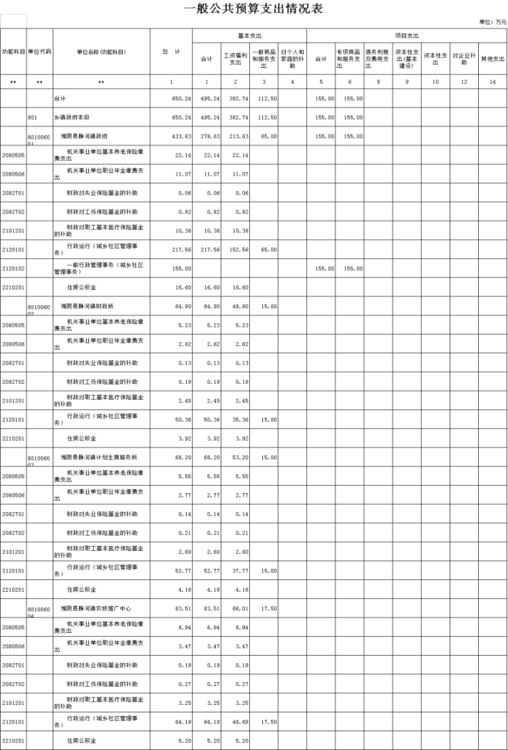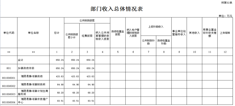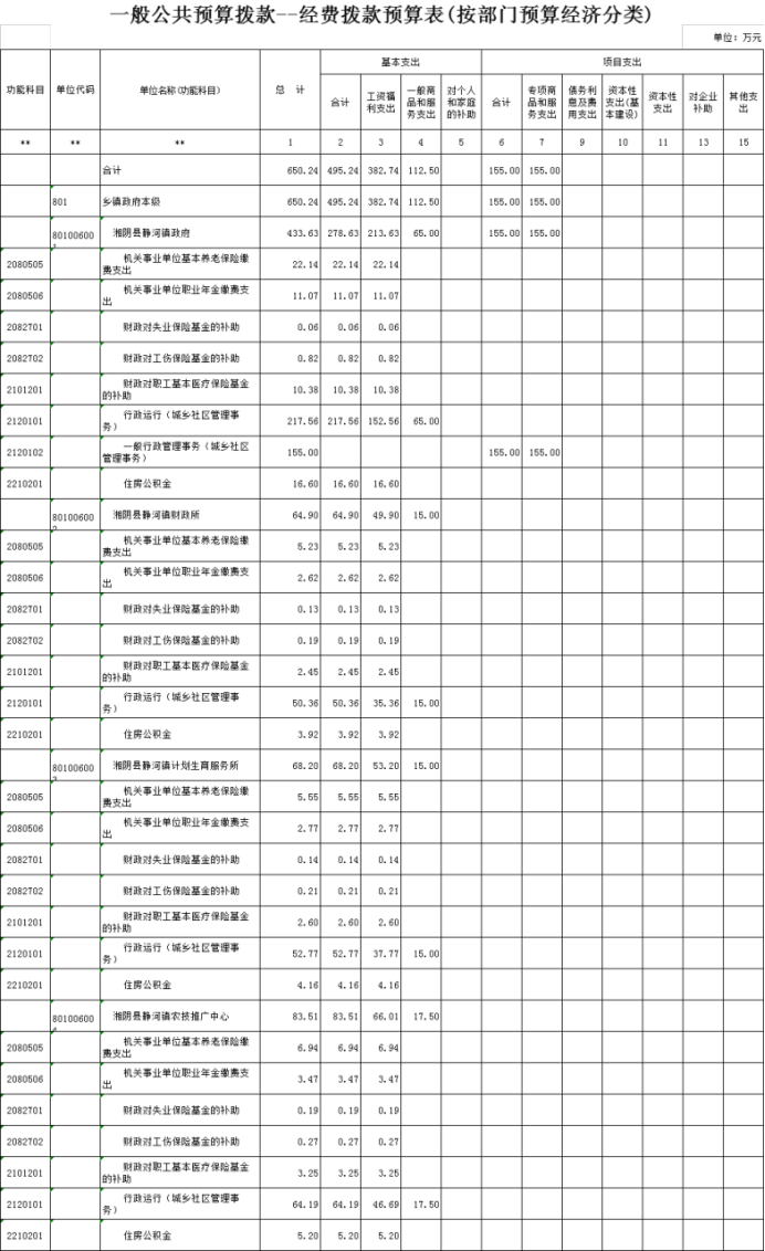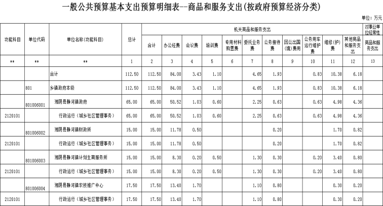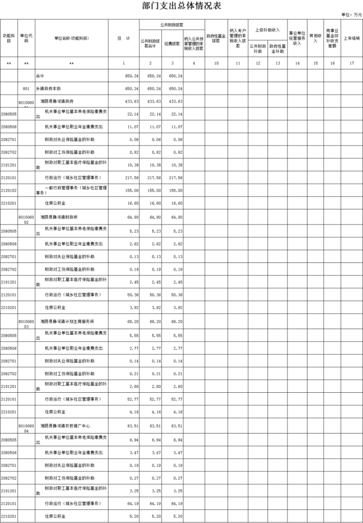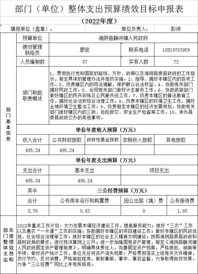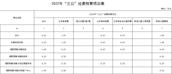 目录 第一部分 湘阴县静河镇人民政府2022年部门预算说明 一、部门基本概况 (一)职能职责 二、部门预算单位构成 三、部门收支总体情况 (一)收入预算 (二)支出预算 四、一般公共预算拨款支出预算 (一)基本支出 (二)项目支出 五、政府性基金预算支出 六、其他重要事项的情况说明 (一)机关运行经费 (二)“三公”经费预算 (三)一般性支出情况 (四)政府采购情况 (五)国有资产占有使用及新增资产配置情况 (六)重点项目预算的绩效目标等预算绩效情况说明 六、名词解释 第二部分 部门预算公开表格 一、部门收支总表 二、部门收入总表 三、部门支出总表 四、部门支出总表(分类) 五、部门支出总表(按政府预算经济分类) 六、工资福利支出预算表 七、工资福利支出(按政府预算经济分类) 八、一般商品和服务支出预算表 九、一般商品和服务支出预算(按政府预算) 十、对个人和家庭的补助支出预算表 十一、对个人和家庭的补助支出预算表(按政府预算)、 十二、财政拨款收支总表 十三、一般预算拨款支出预算表 十四、一般预算拨款基本支出预算表 十五、一般预算拨款——工资福利支出预算表 十六、一般预算拨款——工资福利支出预算表(按政府预算经济分类) 十七、一般预算拨款——一般商品和服务支出预算表 十八、一般预算拨款——一般商品和服务支出预算表(按政府预算) 十九、一般预算拨款——对个人和家庭的补助支出预算表 二十、一般预算拨款——对个人和家庭的补助支出预算表(按政府预算) 二十一、支出预算项目明细表 二十二、政府性基金拨款支出预算表 二十三、政府性基金拨款支出预算表(按政府预算经济分类) 二十四、纳入专户管理的非税收入拨款支出预算表 二十五、纳入专户管理的非税收入拨款支出预算表(按政府预算经济分类) 二十六、经费拨款支出预算表 二十七、经费拨款支出预算表(按政府预算经济分类) 二十八、2022年“三公”经费预算公开表 二十九、部门(单位)整体支出预算绩效目标申报表 三十、财政支出项目预算绩效目标申报表 第一部分 湘阴县静河镇人民政府2022年部门预算说明 一、部门基本概况 (一)职能职责:湘阴县静河镇人民政府常住人口3.2万人,下辖10个村级部门单位(1个社区、9个村级部门),村干部人数66人,静河财政所承担静河镇人民政府的财务收支计划、决算编制和预算执行、预算调整、非税收入的收缴管理的具体工作;负责静河镇所属单位的财务核算和监督;负责全镇财政票据申购、领发、缴销以及资金的解缴;负责财政资金的监管,各项惠农补贴的核定和对付;负责农村社会保障资金的管理;负责国有资产管理;负责政府性债权债务的管理;负责财经法律法规及相关政策的执行。 (二)机构设置:根据编委核定,静河镇人民政府属于行政单位,所属部门单位全部纳入2022年部门预算编制范围。 二、部门预算单位构成 静河镇部门预算单位主要由静河镇人民政府本级、静河镇财政所、静河镇政务便民中心、静河镇农业综合服务中心、静河镇退役军人服务站、静河镇综合行政执法大队、静河镇水利服务站等部门单位构成。 三、部门收支总体情况 2022年部门预算包括本级预算和所含预算单位在内的汇总情况。 本单位2022年没有政府性基金预算拨款和纳入专户管理的非税收入拨款收入,也没有使用政府性基金预算拨款和纳入专户管理的非税收入拨款安排的支出,收入包括经费拨款,也包括纳入预算管理的非税收入拨款;支出包括保障单位基本运行的经费,也包括项目经费。 (一)收入预算 2022年本部门预算收入650.24万元,其中财政拨款收入650.24万元 (二)支出预算 2022年本部门预算支出650.24万元,主要用于机关运转经费495.24万元,项目支出155万元。 四、一般公共预算拨款支出预算 2022年一般公共预算拨款支出预算650.24万元,具体安排情况如下: (一)基本支出:2022年基本支出年初预算数为495.24万元,主要是保障单位机构正常运转、完成日常工作任务而发生的各项支出,包括用于基本工资、津贴补贴等人员经费以及办公费、印刷费、水电费、差旅费等日常公用经费。 (二)项目支出:2022年项目支出年初预算数为155万元,是指单位为完成特定行政工作任务或事业发展目标而发生的支出,包括有关业务工作经费和运行维护经费。 五、政府性基金支出预算 2022年度本部门无政府性基金安排的支出。 六、其他重要事项的情况说明 (一)机关运行经费 本部门2022年机关运行经费当年一般公共预算拨款495.24万元,减少3.75万元,减少0.75%,主要原因是政府财政缩减了人员预算。 (二)“三公”经费预算 本部门2022年“三公”经费预算数4.42万元,其中,公务接待费1.93万元,因公出国(境)费0万元,公务用车购置及运行费0.83万元(其中,公务用车购置费0万元,公务用车运行费0.83万元),其他交通工具购置0万元,其他交通费用1.66万元。 (三)一般性支出情况本部门 2022年办公费预算40.63万元,印刷费预算13.8万元,水电费预算24.21万元,差旅费预算1万,维护费预算10.38万元,租赁费2.7万,会议费预算3.43万元,培训费预算1.1万元,公务接待预算1.93万元,劳务费预算4.65万元,公车运行维护费预算0.83万元,其他交通费用预算1.66万元,其他商品和服务支出6.18万元。 (四)政府采购情况 本部门2022年政府采购预算总额267.5万元。 (五)国有资产占有使用及新增资产配置情况 