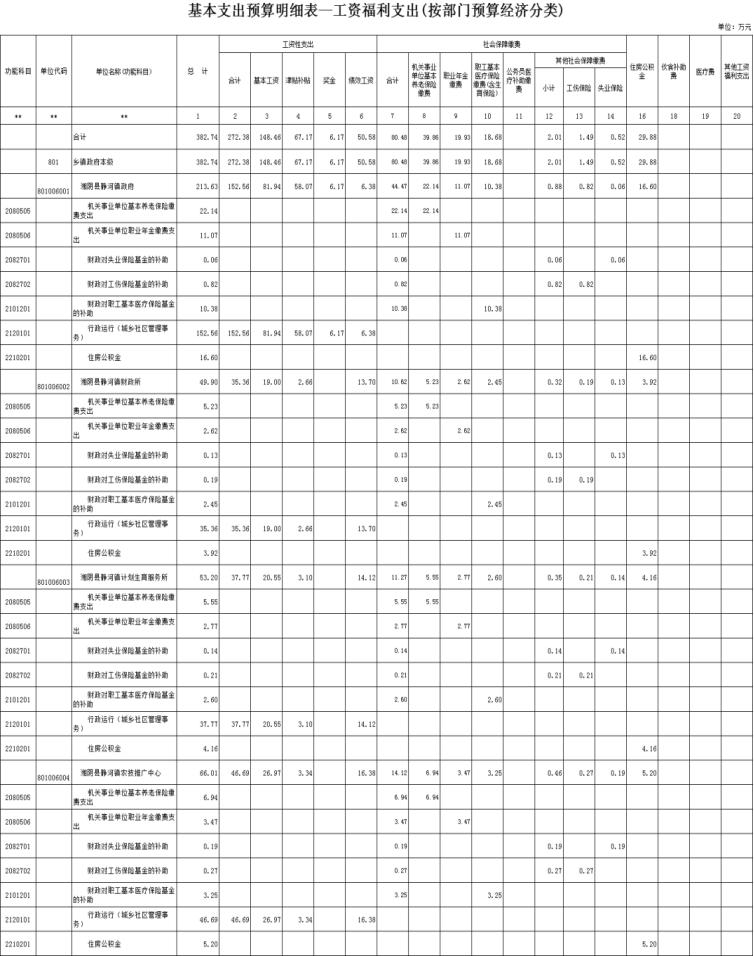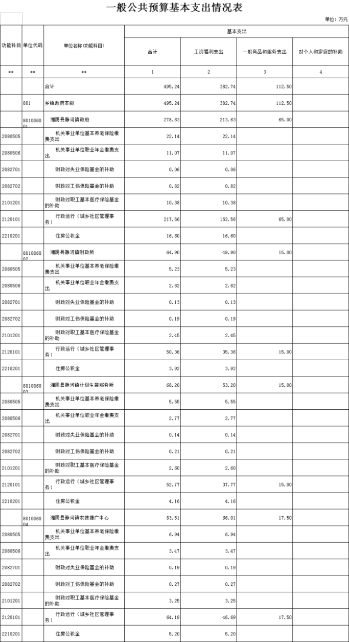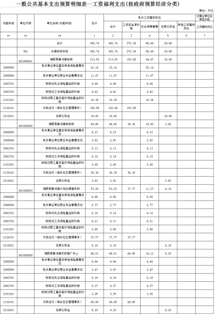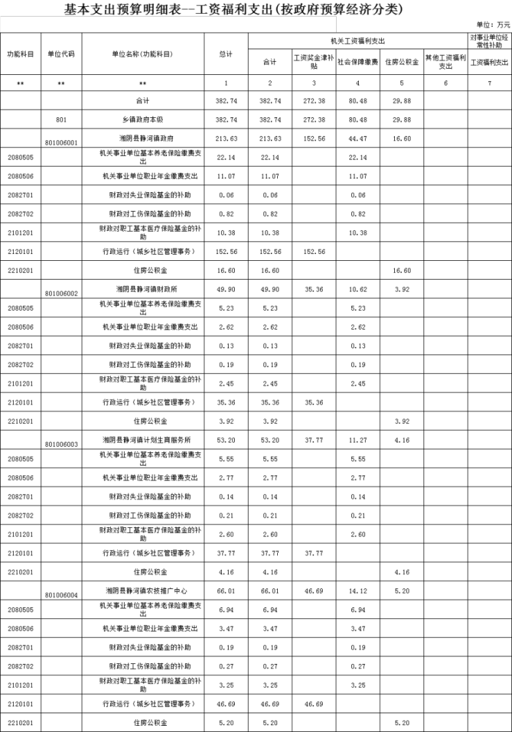 目录 第一部分 湘阴县静河镇人民政府2022年部门预算说明 一、部门基本概况 (一)职能职责 二、部门预算单位构成 三、部门收支总体情况 (一)收入预算 (二)支出预算 四、一般公共预算拨款支出预算 (一)基本支出 (二)项目支出 五、政府性基金预算支出 六、其他重要事项的情况说明 (一)机关运行经费 (二)“三公”经费预算 (三)一般性支出情况 (四)政府采购情况 (五)国有资产占有使用及新增资产配置情况 (六)重点项目预算的绩效目标等预算绩效情况说明 六、名词解释 第二部分 部门预算公开表格 一、部门收支总表 二、部门收入总表 三、部门支出总表 四、部门支出总表(分类) 五、部门支出总表(按政府预算经济分类) 六、工资福利支出预算表 七、工资福利支出(按政府预算经济分类) 八、一般商品和服务支出预算表 九、一般商品和服务支出预算(按政府预算) 十、对个人和家庭的补助支出预算表 十一、对个人和家庭的补助支出预算表(按政府预算)、 十二、财政拨款收支总表 十三、一般预算拨款支出预算表 十四、一般预算拨款基本支出预算表 十五、一般预算拨款——工资福利支出预算表 十六、一般预算拨款——工资福利支出预算表(按政府预算经济分类) 十七、一般预算拨款——一般商品和服务支出预算表 十八、一般预算拨款——一般商品和服务支出预算表(按政府预算) 十九、一般预算拨款——对个人和家庭的补助支出预算表 二十、一般预算拨款——对个人和家庭的补助支出预算表(按政府预算) 二十一、支出预算项目明细表 二十二、政府性基金拨款支出预算表 二十三、政府性基金拨款支出预算表(按政府预算经济分类) 二十四、纳入专户管理的非税收入拨款支出预算表 二十五、纳入专户管理的非税收入拨款支出预算表(按政府预算经济分类) 二十六、经费拨款支出预算表 二十七、经费拨款支出预算表(按政府预算经济分类) 二十八、2022年“三公”经费预算公开表 二十九、部门(单位)整体支出预算绩效目标申报表 三十、财政支出项目预算绩效目标申报表 第一部分 湘阴县静河镇人民政府2022年部门预算说明 一、部门基本概况 (一)职能职责:湘阴县静河镇人民政府常住人口3.2万人,下辖10个村级部门单位(1个社区、9个村级部门),村干部人数66人,静河财政所承担静河镇人民政府的财务收支计划、决算编制和预算执行、预算调整、非税收入的收缴管理的具体工作;负责静河镇所属单位的财务核算和监督;负责全镇财政票据申购、领发、缴销以及资金的解缴;负责财政资金的监管,各项惠农补贴的核定和对付;负责农村社会保障资金的管理;负责国有资产管理;负责政府性债权债务的管理;负责财经法律法规及相关政策的执行。 (二)机构设置:根据编委核定,静河镇人民政府属于行政单位,所属部门单位全部纳入2022年部门预算编制范围。 二、部门预算单位构成 静河镇部门预算单位主要由静河镇人民政府本级、静河镇财政所、静河镇政务便民中心、静河镇农业综合服务中心、静河镇退役军人服务站、静河镇综合行政执法大队、静河镇水利服务站等部门单位构成。 三、部门收支总体情况 2022年部门预算包括本级预算和所含预算单位在内的汇总情况。 本单位2022年没有政府性基金预算拨款和纳入专户管理的非税收入拨款收入,也没有使用政府性基金预算拨款和纳入专户管理的非税收入拨款安排的支出,收入包括经费拨款,也包括纳入预算管理的非税收入拨款;支出包括保障单位基本运行的经费,也包括项目经费。 (一)收入预算 2022年本部门预算收入650.24万元,其中财政拨款收入650.24万元 (二)支出预算 2022年本部门预算支出650.24万元,主要用于机关运转经费495.24万元,项目支出155万元。 四、一般公共预算拨款支出预算 2022年一般公共预算拨款支出预算650.24万元,具体安排情况如下: (一)基本支出:2022年基本支出年初预算数为495.24万元,主要是保障单位机构正常运转、完成日常工作任务而发生的各项支出,包括用于基本工资、津贴补贴等人员经费以及办公费、印刷费、水电费、差旅费等日常公用经费。 (二)项目支出:2022年项目支出年初预算数为155万元,是指单位为完成特定行政工作任务或事业发展目标而发生的支出,包括有关业务工作经费和运行维护经费。 五、政府性基金支出预算 2022年度本部门无政府性基金安排的支出。 六、其他重要事项的情况说明 (一)机关运行经费 本部门2022年机关运行经费当年一般公共预算拨款495.24万元,减少3.75万元,减少0.75%,主要原因是政府财政缩减了人员预算。 (二)“三公”经费预算 本部门2022年“三公”经费预算数4.42万元,其中,公务接待费1.93万元,因公出国(境)费0万元,公务用车购置及运行费0.83万元(其中,公务用车购置费0万元,公务用车运行费0.83万元),其他交通工具购置0万元,其他交通费用1.66万元。 (三)一般性支出情况本部门 2022年办公费预算40.63万元,印刷费预算13.8万元,水电费预算24.21万元,差旅费预算1万,维护费预算10.38万元,租赁费2.7万,会议费预算3.43万元,培训费预算1.1万元,公务接待预算1.93万元,劳务费预算4.65万元,公车运行维护费预算0.83万元,其他交通费用预算1.66万元,其他商品和服务支出6.18万元。 (四)政府采购情况 本部门2022年政府采购预算总额267.5万元。 (五)国有资产占有使用及新增资产配置情况 