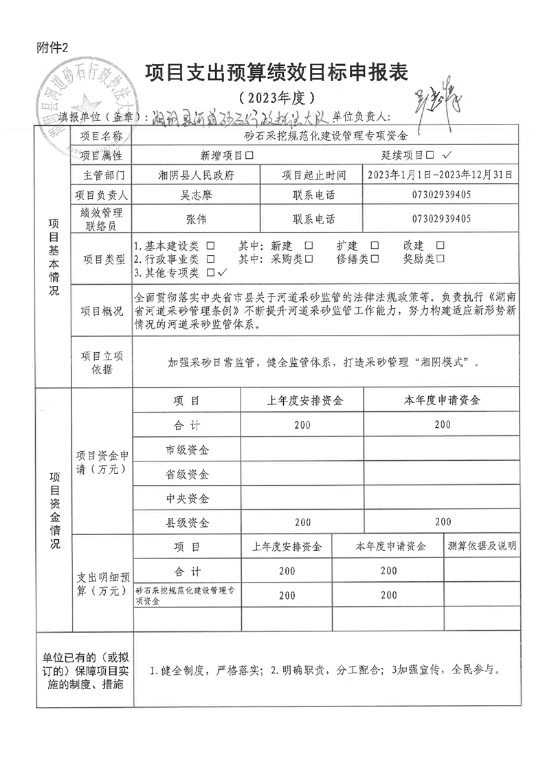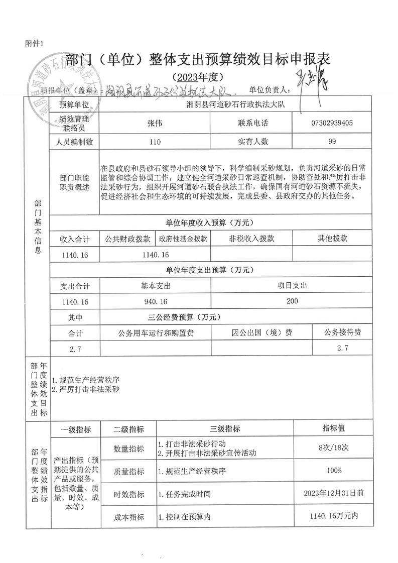 2023年度-湘阴县河道砂石行政执法大队-整体和项目支出预算绩效目标申报表