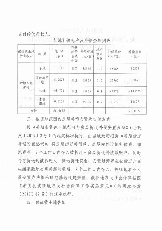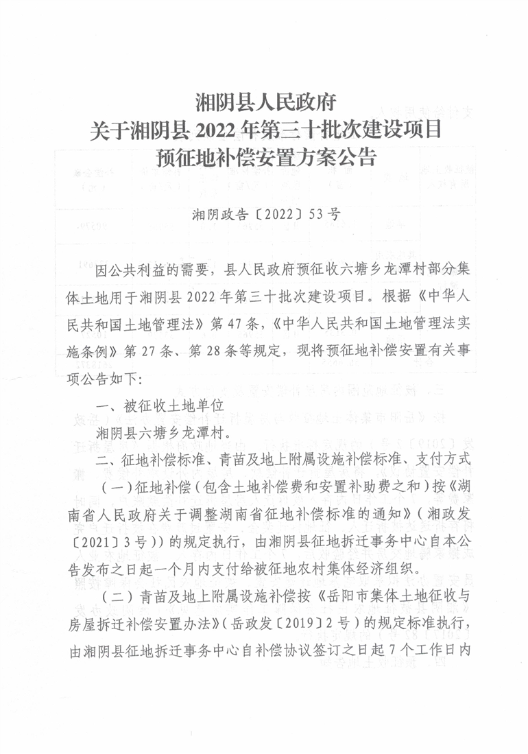 关于湘阴县2022年第三十批次建设项目预征地补偿安置方案公告