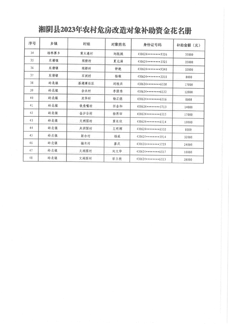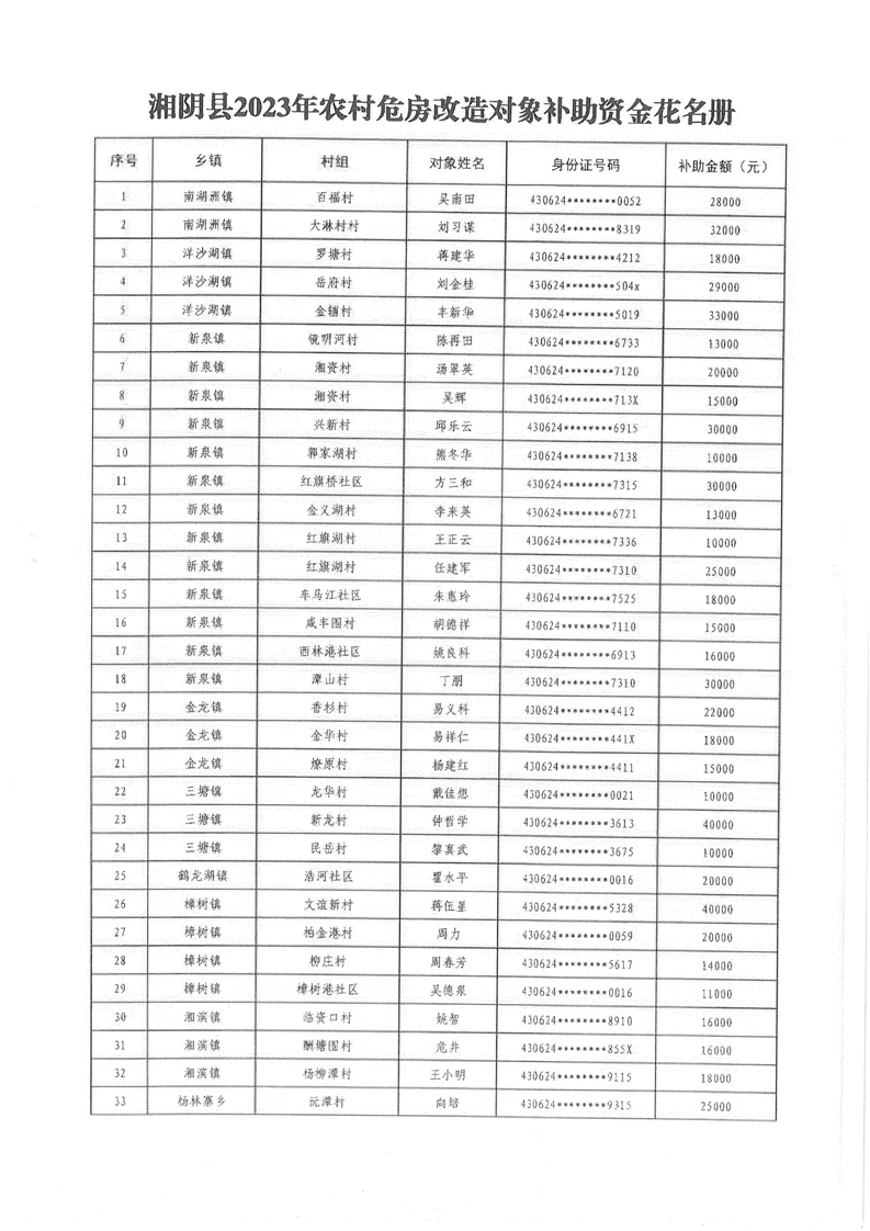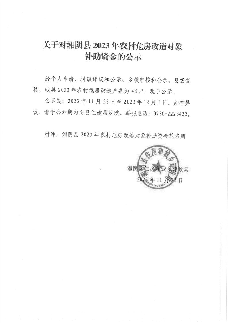 关于对湘阴县2023年农村危房改造对象补助资金的公示