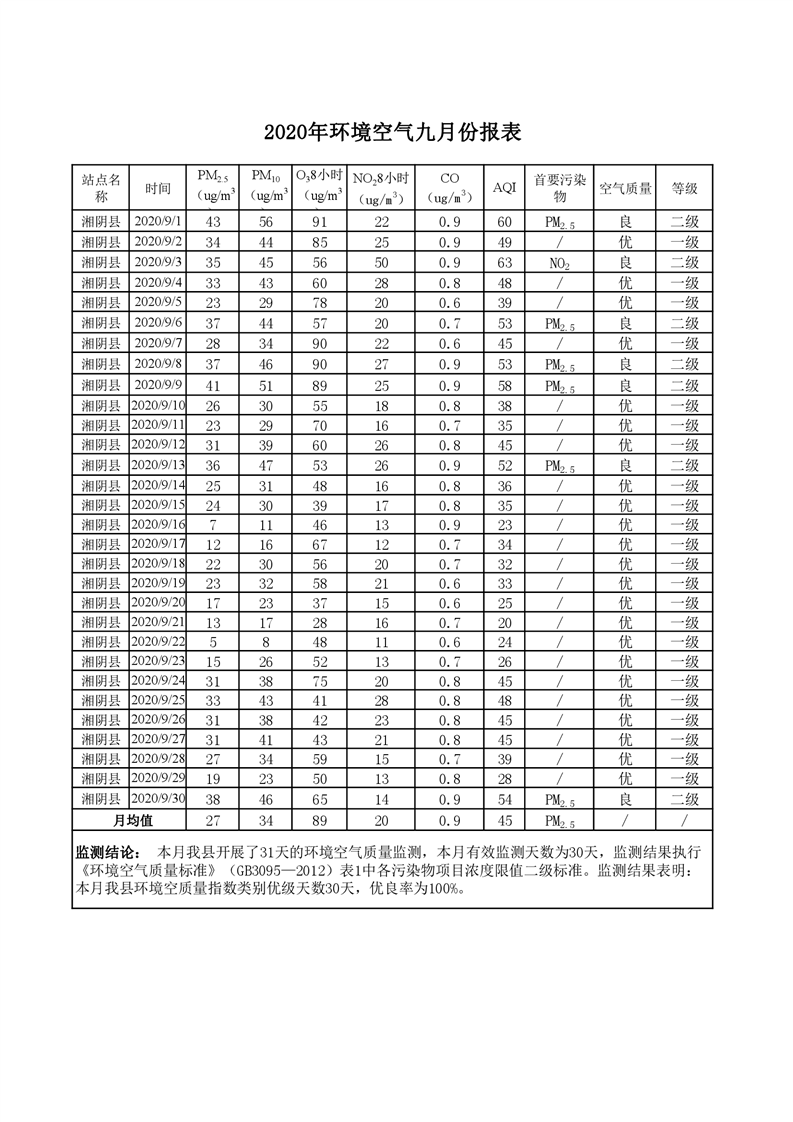 2020年环境空气九月份报表