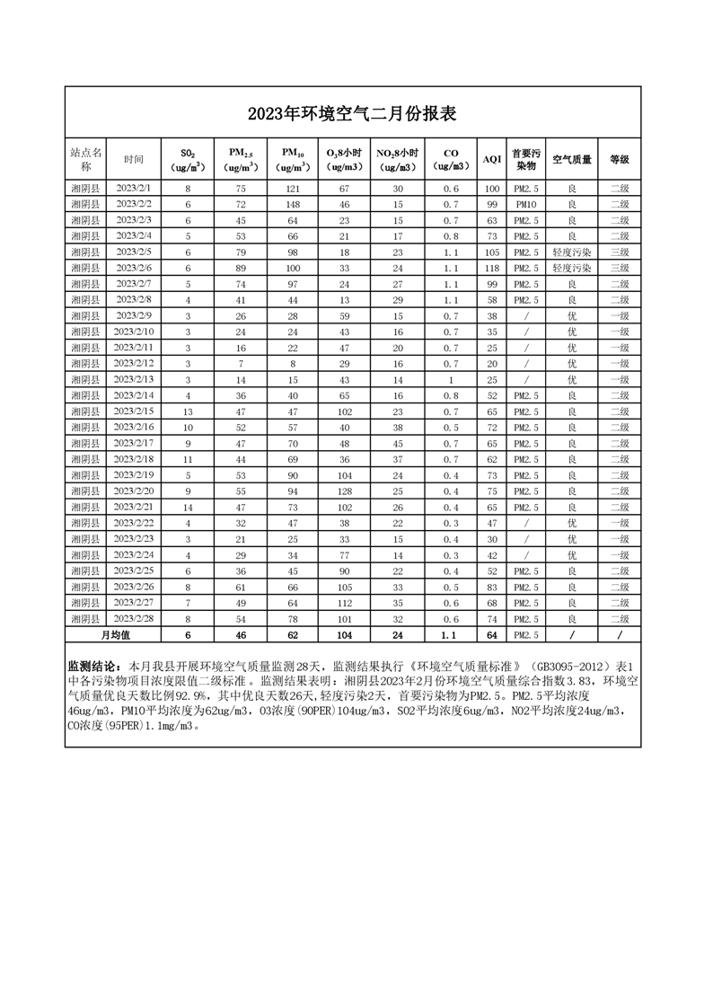 2023年2月份-环境空气质量监测-情况公示