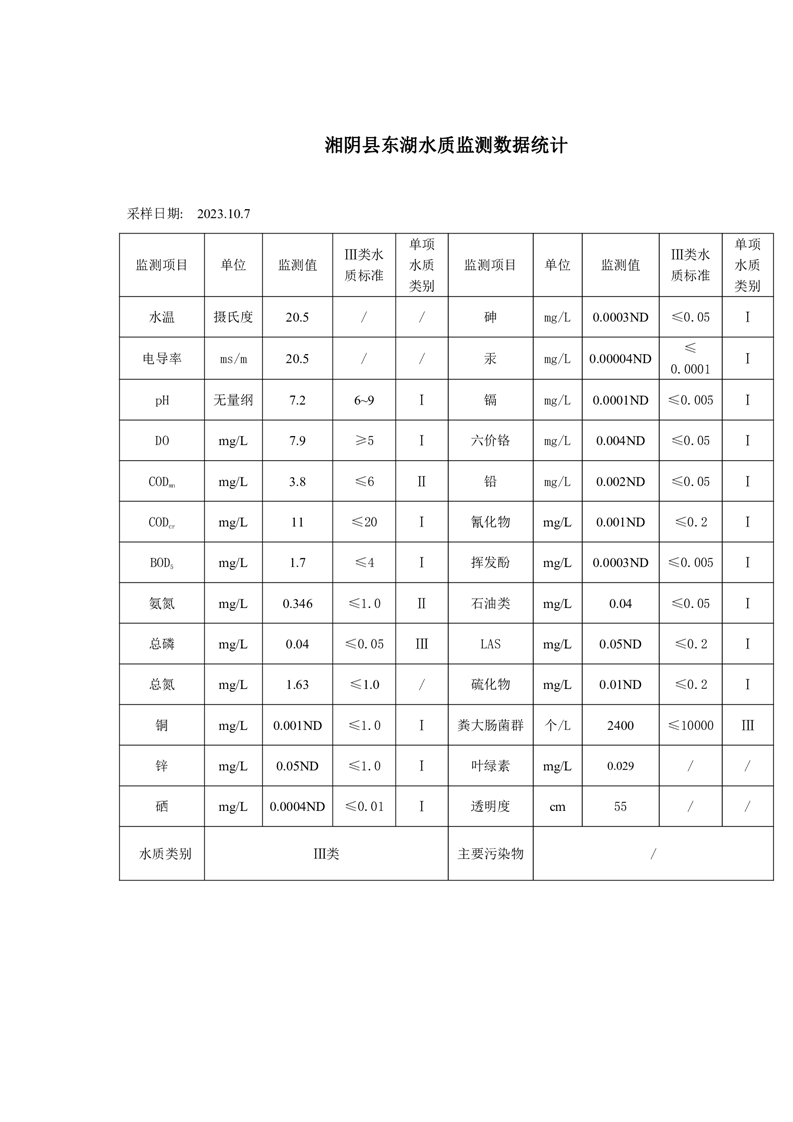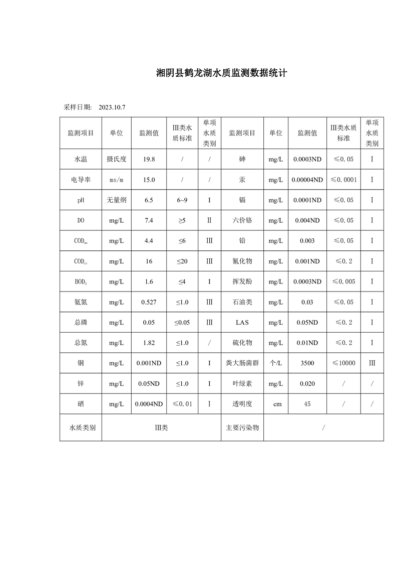 2023年10月份湘阴县水质监测点监测情况公示