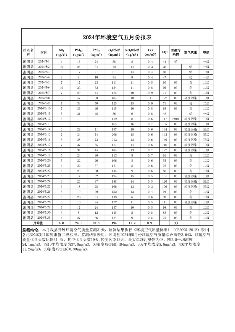 2024年5月份环境空气质量监测情况公示
