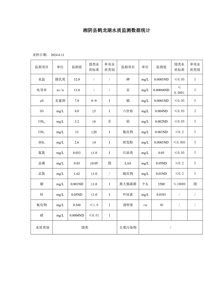 2024年6月份湘阴县水质监测点监测情况公示