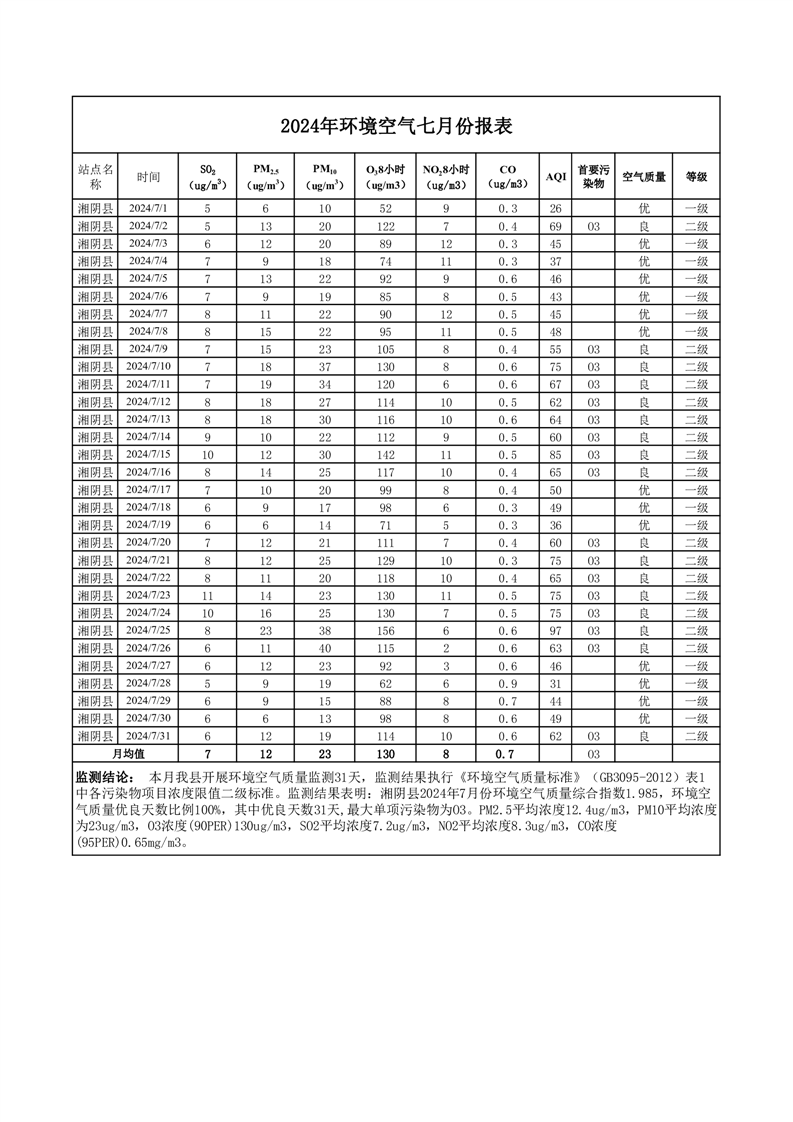 2024年7月份环境空气质量监测情况公示