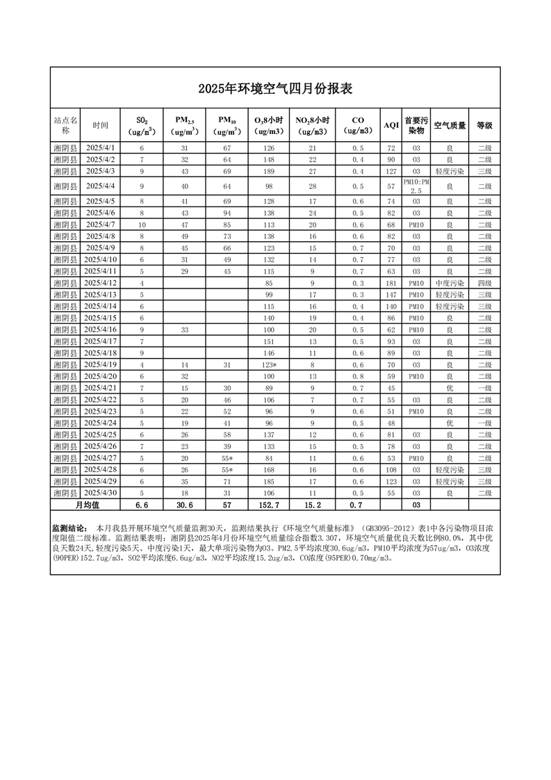 2025年4月份环境空气质量监测情况公示