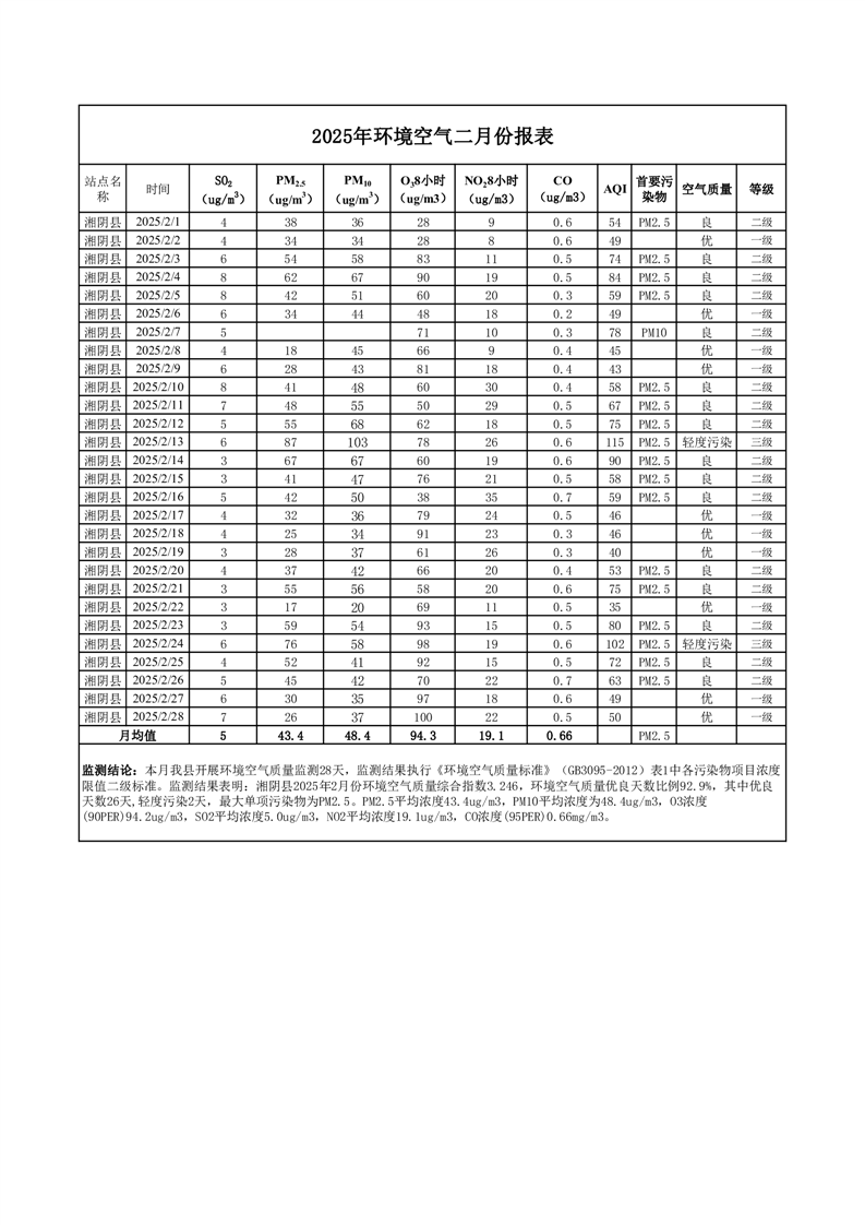 2025年2月份环境空气质量监测情况公示