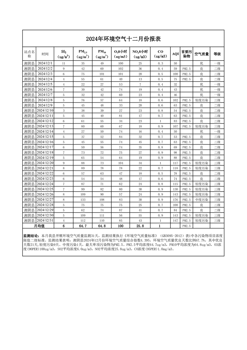 2024年12月份环境空气质量监测情况公示