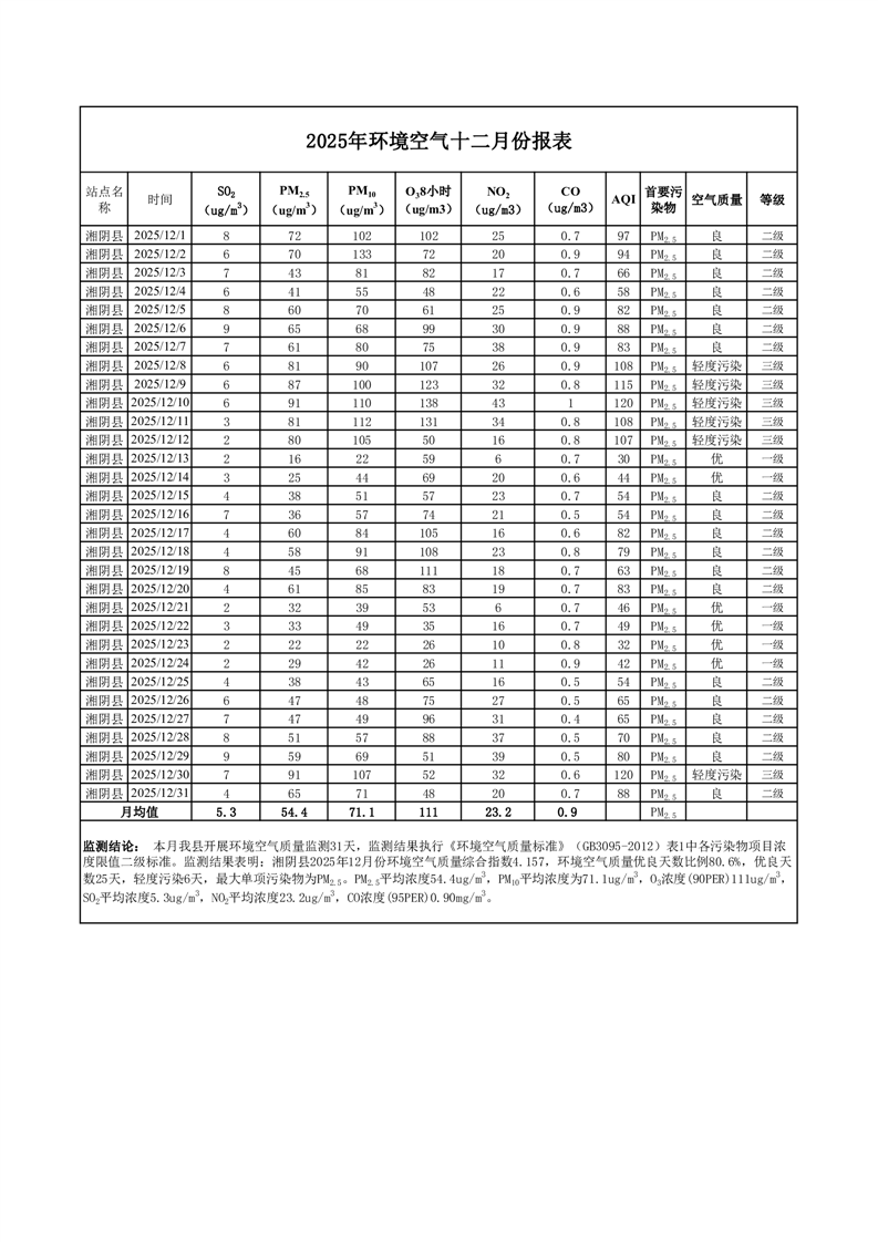 2025年12月份环境空气质量监测情况公示