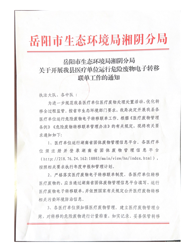 关于开展我县医疗单位运行危险废物电子转移联单工作的通知