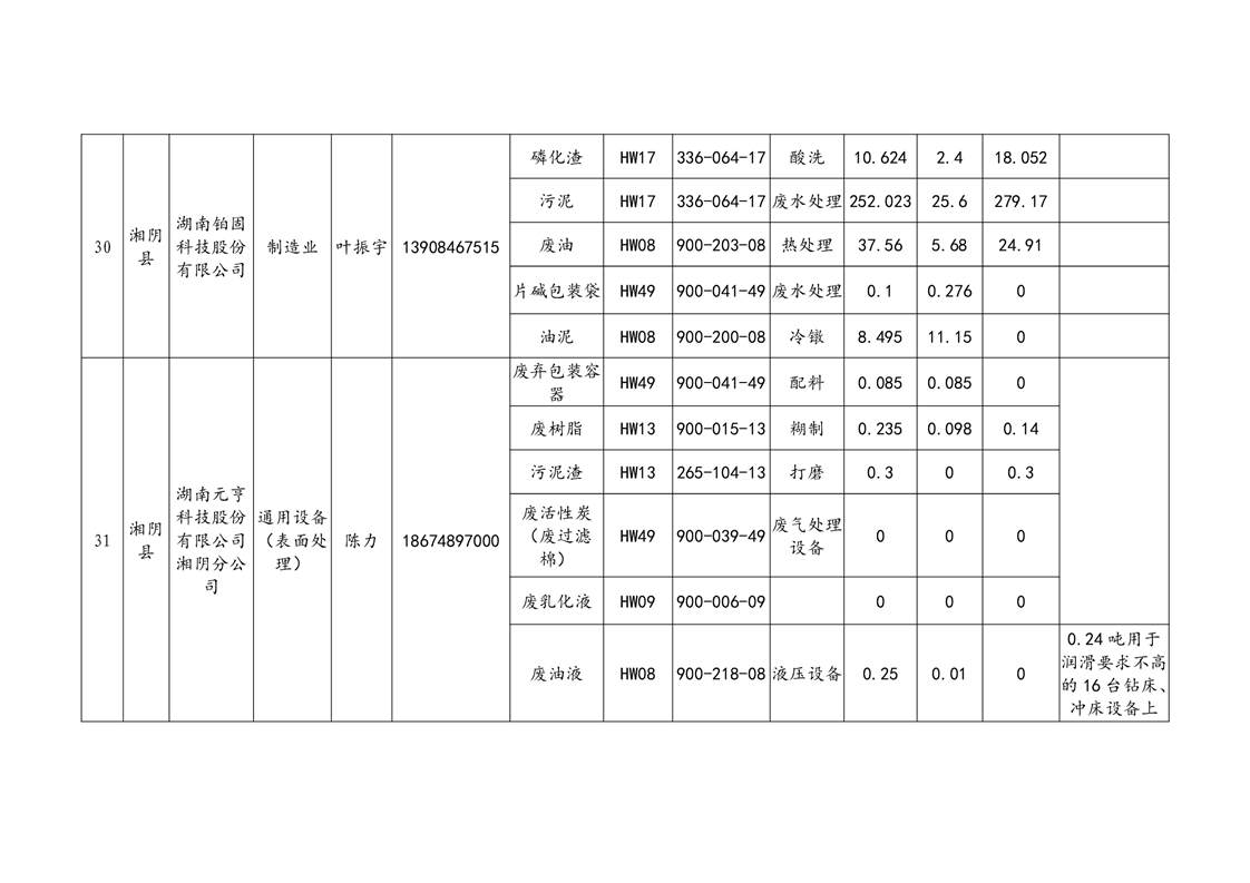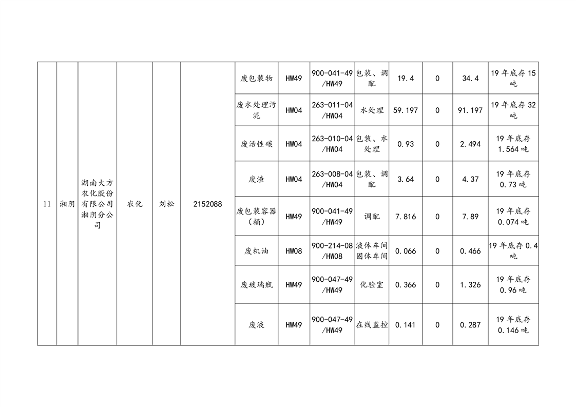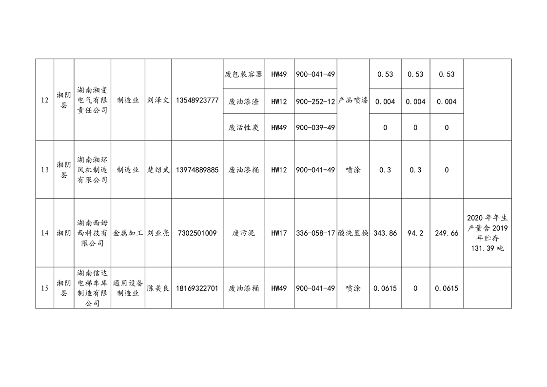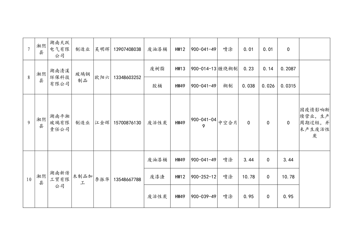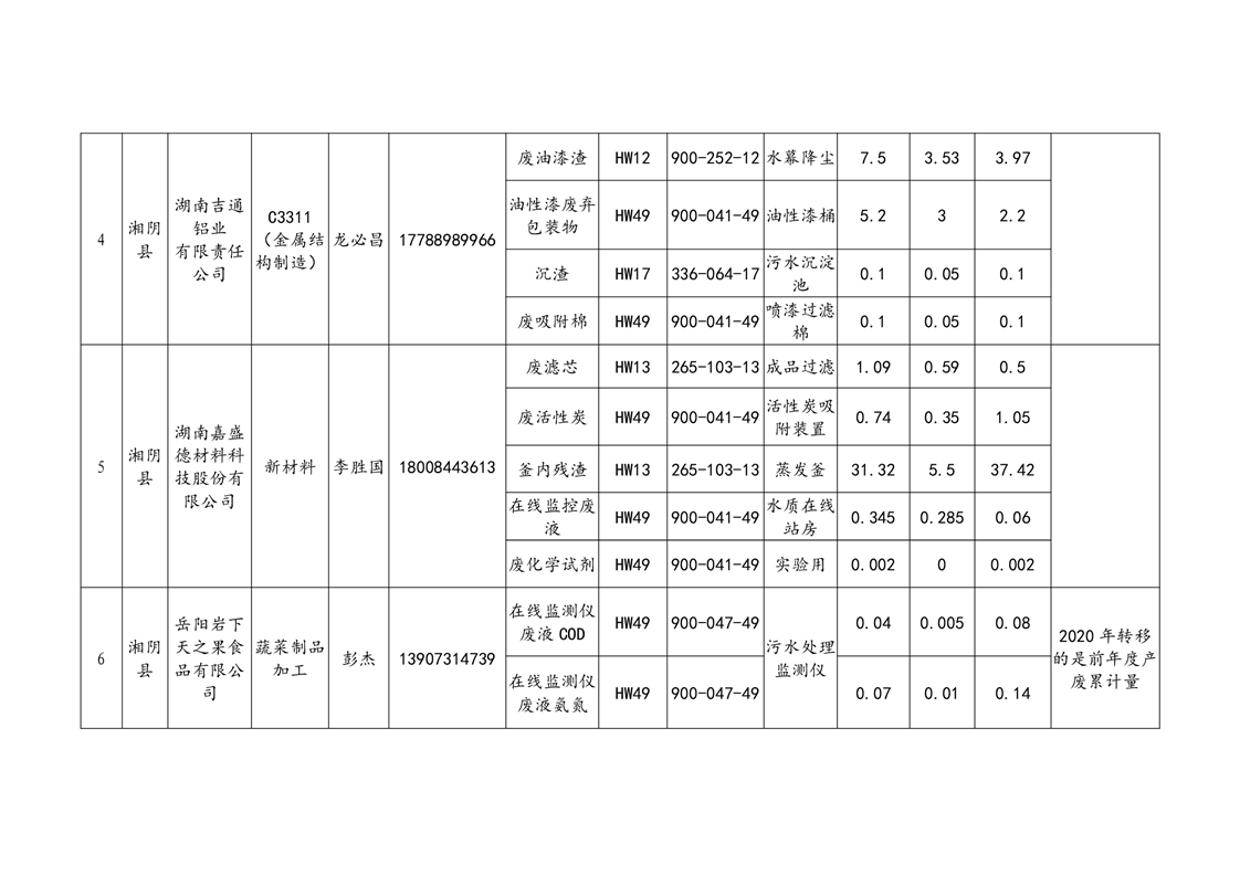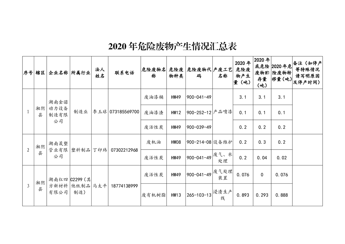 2020年危险废物产生情况汇总表