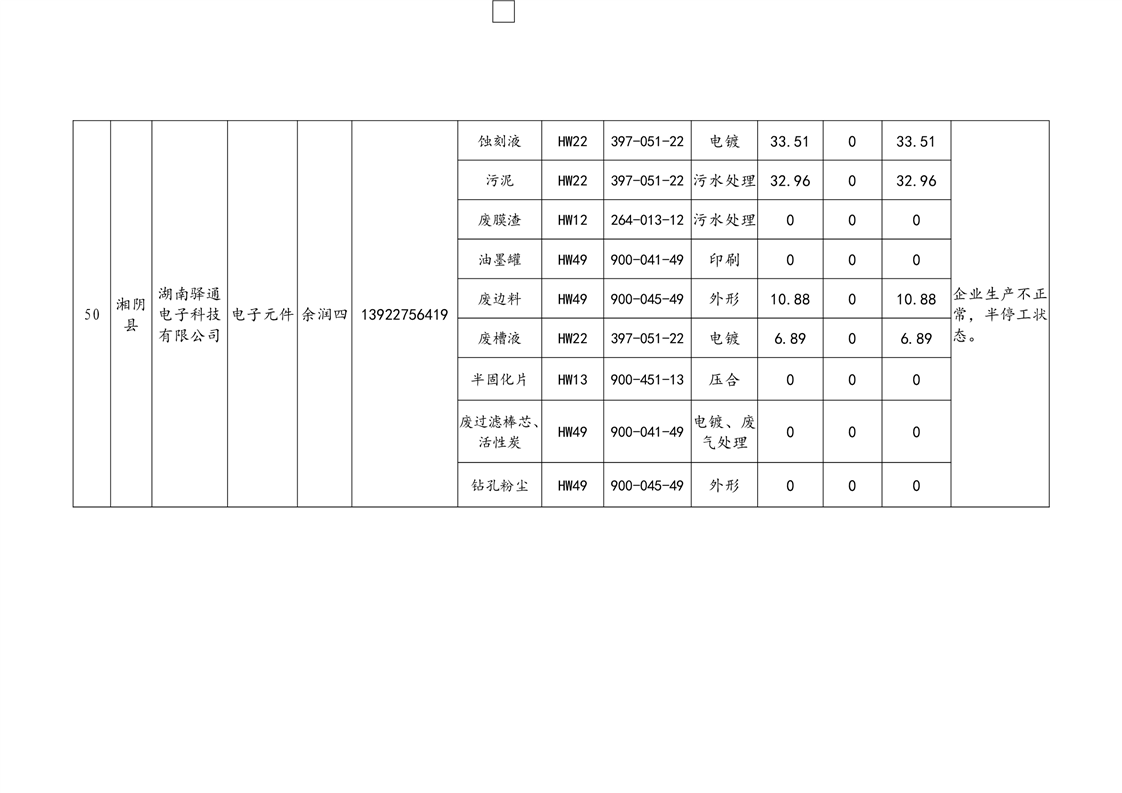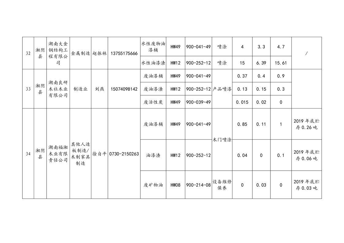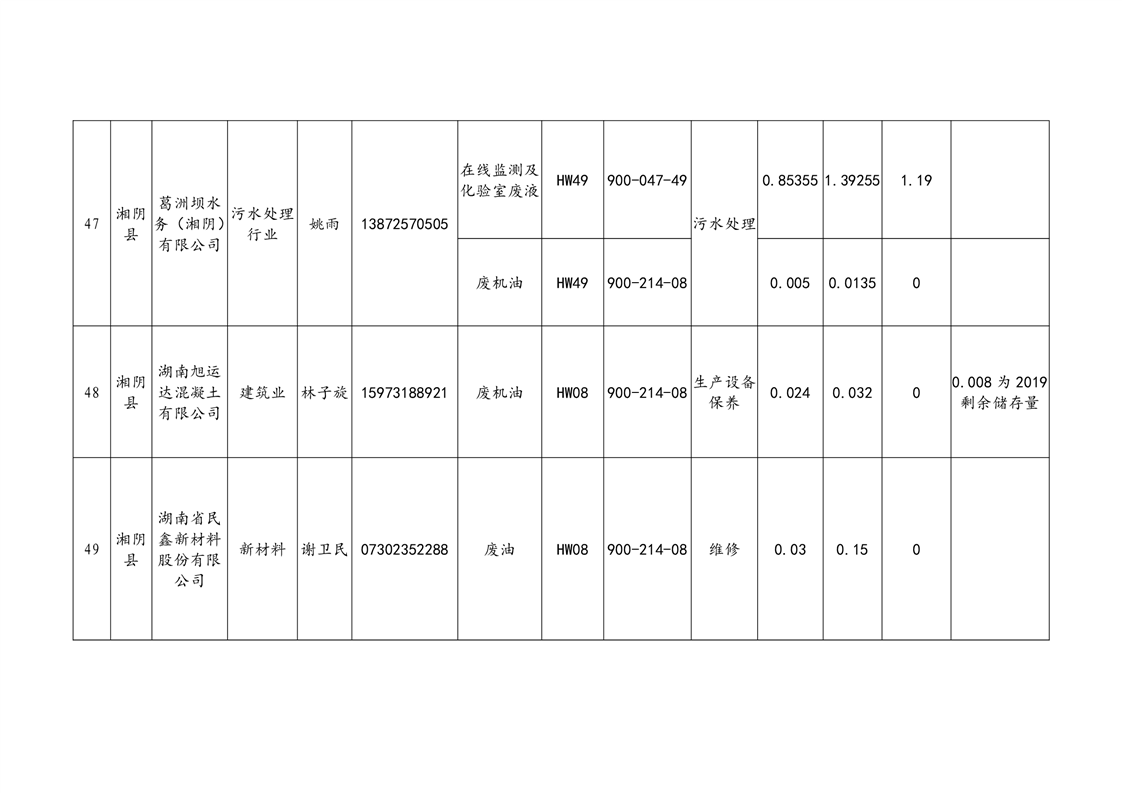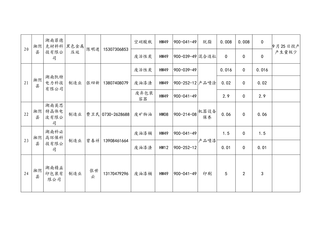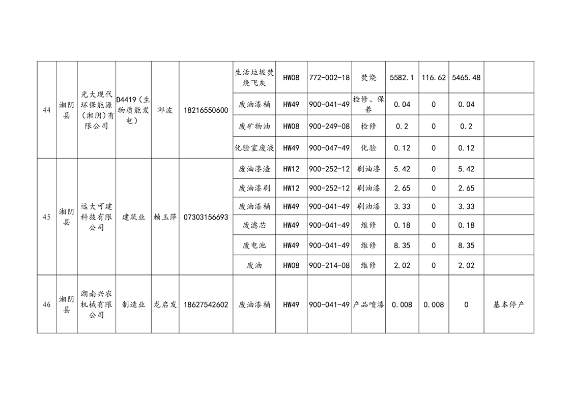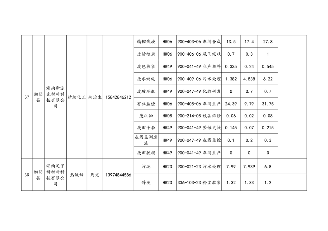 2020年危险废物产生情况汇总表
