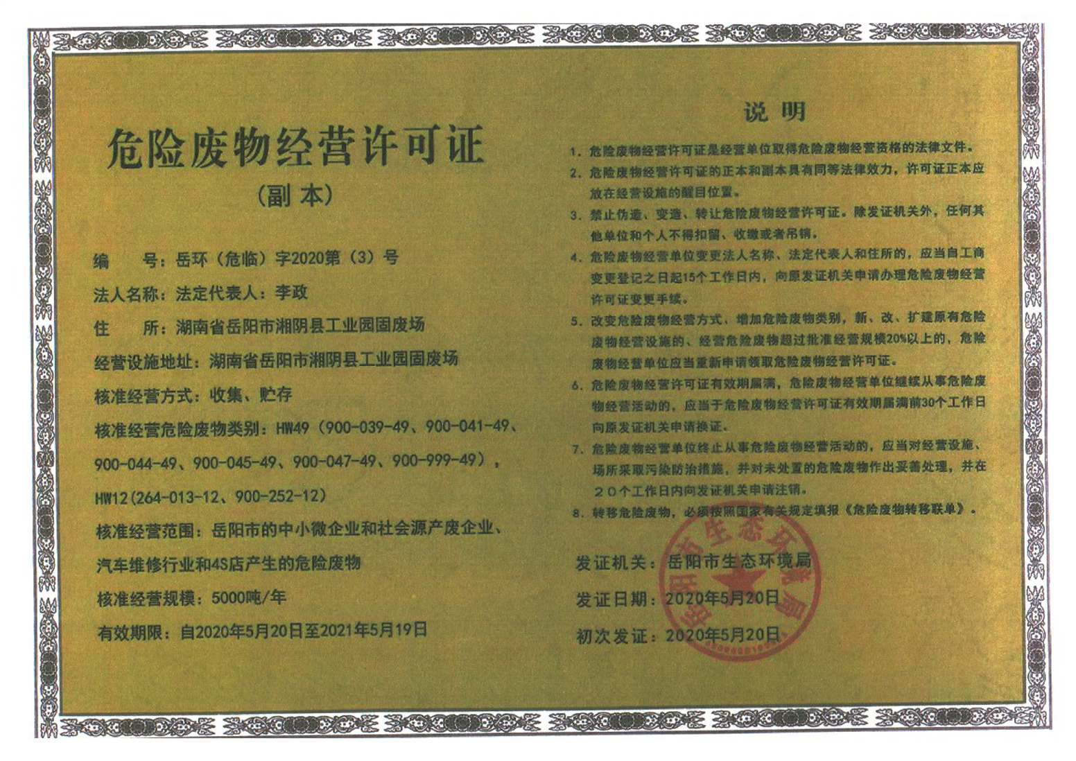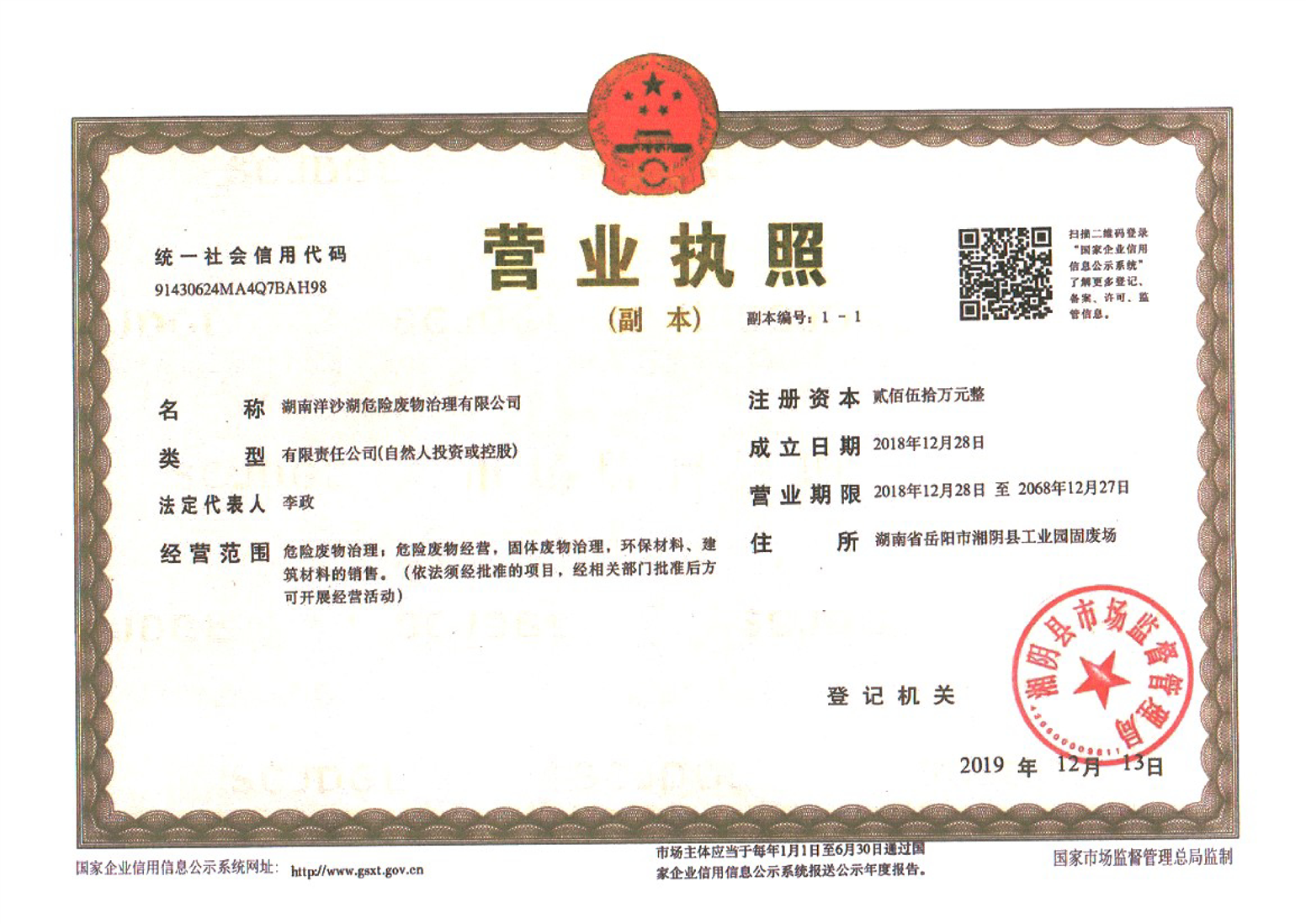湖南省洋沙湖危险废物治理有限公司营业执照、经验许可证