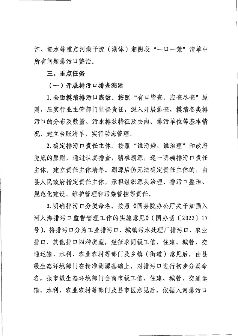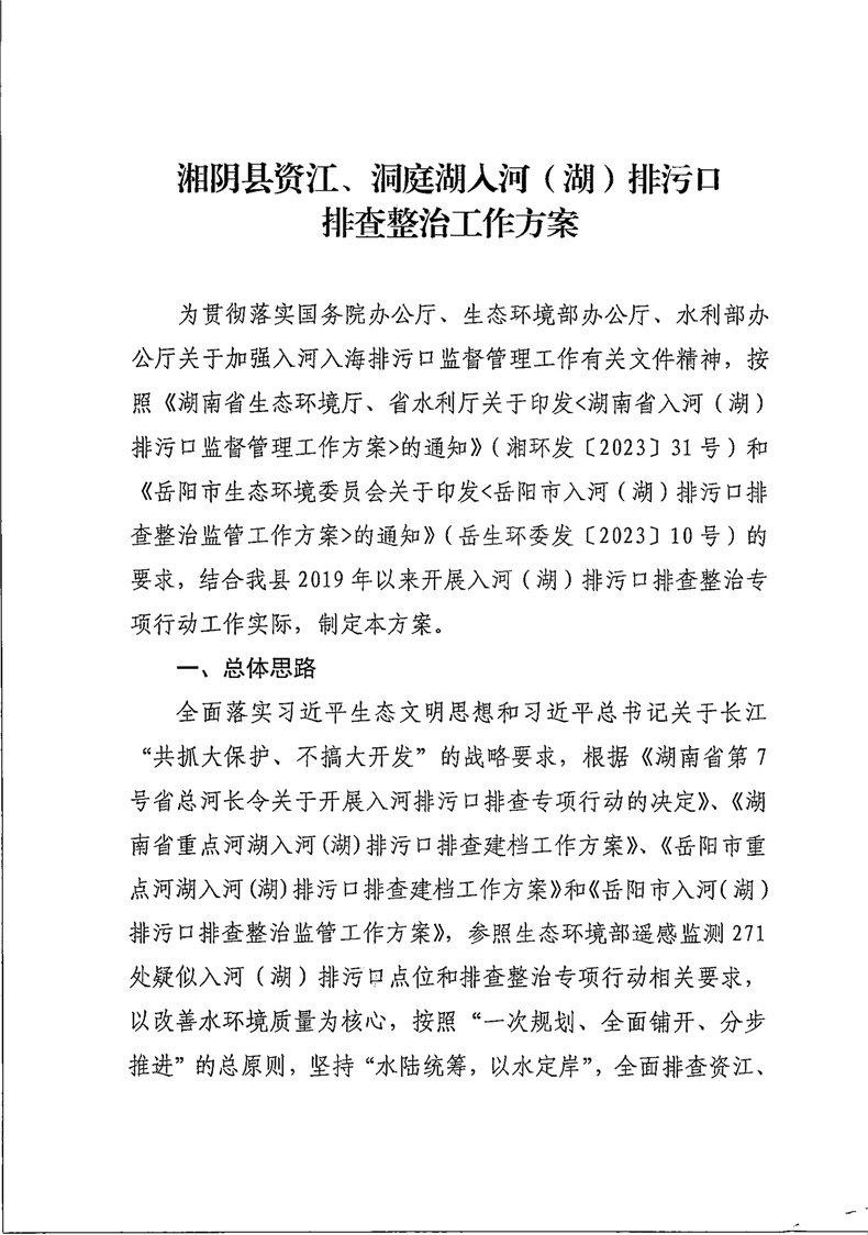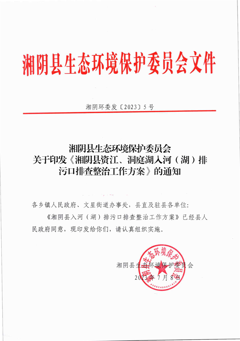 关于印发《湘阴县资江、洞庭湖入河(湖)排污口排查整治工作方安》的通知
