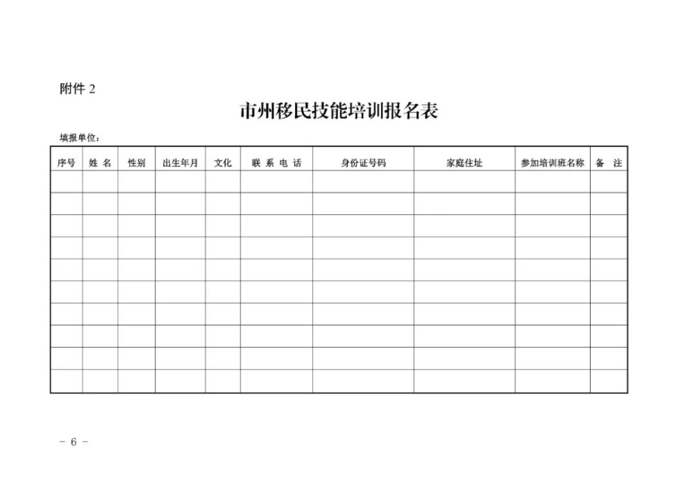 3.学员报到时需携带经当地水库移民机构盖章的《学员登记表》(见附件3)、本人身份证、一寸免冠红底近照 5 张,新能源汽车检修专业学员须携带高中及以上毕业证明。 附件: 1.市州参训名额分配表 2.市州移民技能培训报名表 3.库区移民转移就业技能培训学员登记表