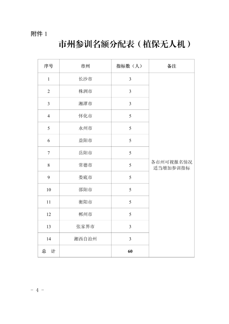 各市州水库移民机构: 根据年度移民培训工作计划,我中心委托常德市三湘丰隆职业技能培训学校举办 2023 年第一期水库移民植保无人机驾驶员培训班。现就有关事项通知如下: 一、报到时间及地点 报到时间:2023年5月28日 报到地点:常德市西湖管理区国际酒店。 二、培训对象及名额 培训对象为 18 至48 周岁,身体健康且有农业产业开发或从事规模化农业生产方面就业创业经验的大中型水库农村移民。计划培训移民 60 人。 三、培训内容、时间及方式 无人机概述、模拟器训练、多轴构造图解、多旋翼无人机使用、外场飞机、手持地面站教学、机电设置安装调试、AB 点实际飞行、植保无人机机械故障排除及维修等。培训时间 30 天其中:理论学习10 天,100 课时; 实际操作 12 天,120 课时;拆装维修8 天,80 课时。采取理论学习、模拟操作与外场飞行训练相结合的方式进行。培训期满,培训机构组织学员参加无人机驾驶员考核,考核通过者颁发人社部门的无人机驾驶员职业培训合格证书。 四、就业方式 通过考核获取植保无人机驾驶员合格证的学员,由培训机构推荐到植保无人机公司就业上岗,也可自主创业或择业。 五、培训费用 学员学习期间培训费、住宿费、考证费、保险费等由省库区移民事务中心统一安排,学员生活费及参训往返交通费自理 (学员按实际参训出勤率可享受每人每天 30 元生活补助)。 六、有关要求 1.各市州、县市区水库移民机构要做好培训工作的宣传发动及相关保障,严格审核移民身份和健康状况,有序组织好有相应就业创业愿望的移民参加培训。请各市州水库移民机构于 2023年 5月24 日前,将汇总后的参训人员名单(见附件2) 报省库区移民事务中心后期扶持部 (联系人:周继征: 报名咨询电话:0731-85495194; 报名咨询时间:工作日上午8:0012:00,下午14:3017:30:电子邮箱: hnympx2008@163.com) 2.省库区移民事务中心将视报名情况对市州培训名额进行相应调整,并将生源输送任务完成情况作为绩效评价的重要依据。 3.学员报到时需携带经当地水库移民机构盖章的《学员登记表》(见附件3)、本人身份证、两寸免冠近照 4 张 附件:1.市州参训名额分配表 (植保无人机) 2.市州移民技能培训报名表 3.库区移民转移就业技能培训学员登记表 4.学校地址、到校路线及联系人 |