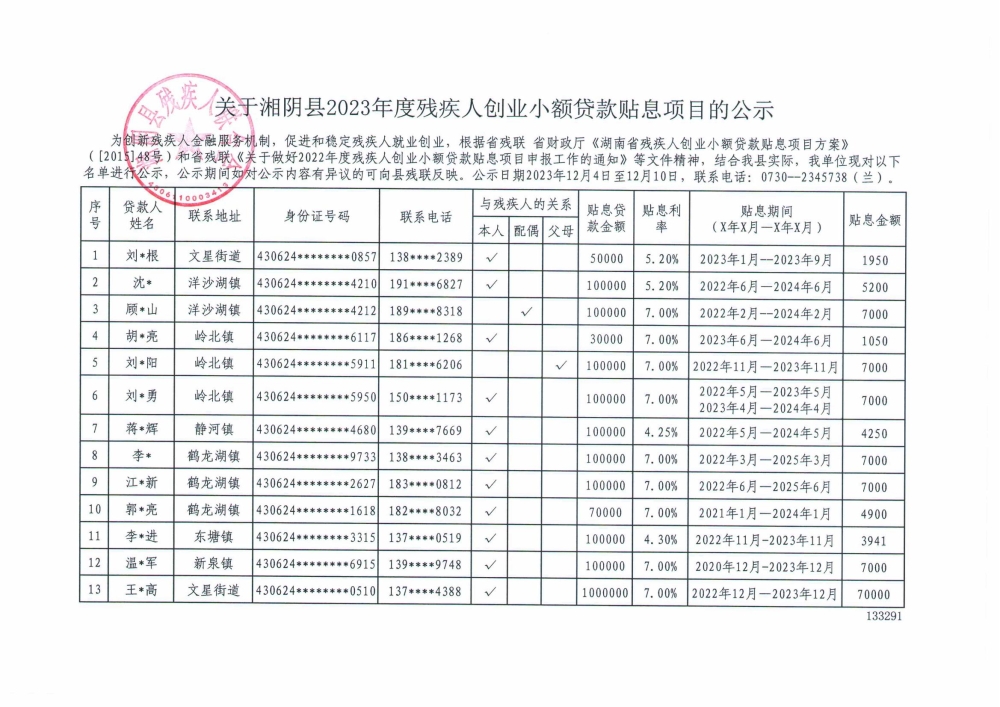 关于湘阴县2023年度残疾人创业小额贷款贴息项目的公示