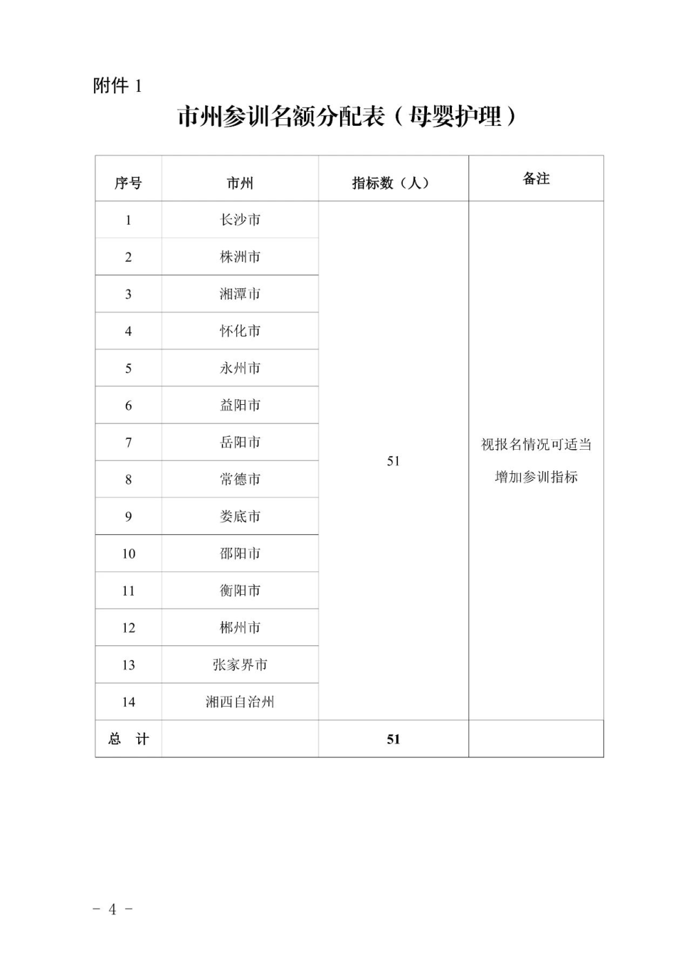 各市州水库移民机构: 根据年度移民培训工作计划,我中心委托省妇幼馨月母婴培训中心举办 2024 年第二期水库移民母婴保健护理员培训班。现就有关事项通知如下: 一、报到时间及地点 2024年11月3日在湖南省妇幼保健院创新楼后面红楼一楼报到。 二、培训对象及名额分配 培训对象为 25 至48 周岁,身体健康且有明确就业意愿的大中型水库农村女性移民。计划培训 51 人。 三、培训内容、时间及方式 剖宫产术后护理及母婴同室月嫂服务工作细则、产后抑郁症的防治和心理健康、产后康复操等。培训时间15天,其中理论学习5天,实习8天,考证2天。培训采用“专家理论教学+模拟实操+产科病房实习”的模式进行。培训期满,由培训机构统一组织学员参加考试。考试合格者可获得湖南省妇幼馨月母婴服务培训中心颁发的母婴保健护理专业培训合格证,以及省人社部门颁发的母婴护理专项职业能力证书。 附件:1.市州参训名额分配表(母婴护理)