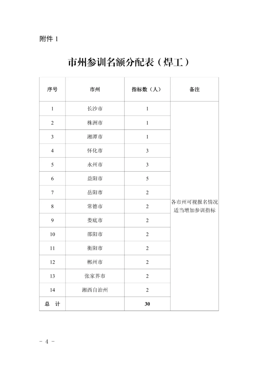 根据移民培训工作年度计划,我中心委托益阳职业技术学院举办2024年第一期水库移民焊工培训班。现就有关事项通知如: 一、报到时间及地点 2024年6月23日在益阳职业技术学院(益阳市迎风桥镇新塘村)报到。 二、培训对象及名额分配 培训对象为 18至48 周岁 (女学员40 周岁以下),有初中及以上毕业证书或学校毕业证明 (报考必备),身体健康且有明确就业创业意愿的大中型水库农村移民。本期计划培训 30 人。 三、培训内容、时间及方式 焊工基础理论知识,焊接基本生产作业包括手工电弧焊CO2气保焊、气焊气割、焊接工艺编制、焊接生产质量检验等知识和技能。本期培训采用项目式教学方法,由专业理论教师和实训教师授课。培训时间 30 天,共170 课时,其中理论培训 100课时,实训 64 课时,理论考试 2 课时,实操考试 4 课时。培训结束,将组织学员进行焊工技能考核,考核合格者可获得省应急管理厅签发的焊工特种作业操作证。 四、就业方式 学员结业后可由学校推荐到相关行业企业就业,也可自主择业。主要就业方向有工程装备制造、船舶制造、机械设备制造轨道交通装备、电力、有色等行业,主要岗位有焊接质量检验、焊接装备操作、焊接设备和机械维修、焊接和特殊焊接、工艺评定操作等。 五、培训费用 学员学习期间培训费、学杂费、住宿费、考证费、床上用品费、保险费、考试交通费、耗材费等由省库区移民事务中心统-安排,学员生活费及参训往返交通费自理 (学员按实际参训出勤率可享受每人每天 30 元生活补助)。 六、有关要求 1.各市州、县市区水库移民机构要做好宣传发动及相关保障工作,严格审核移民身份和健康状况,有序组织好有相应就业创业愿望的移民参加培训。请各市州水库移民机构于 2024 年 6月18 日前将汇总后的参训人员名单(见附件 2) 报省库区移民事务中心后期扶持部(联系人:周继征: 报名咨询电话: 0731-85495194:报名咨询时间:工作日上午8:00-12:00,下午14:30-17:30:电子邮箱:hnympx2008@163.com)。 2.省库区移民事务中心将视报名情况对市州培训名额进行相应调整,并将生源输送任务完成情况作为绩效评价的重要依据。 3.学员报到时需提供初中及以上毕业证书或学校毕业证明并携带经当地水库移民机构盖章的《学员登记表》(见附件 3)、本人身份证。 附件: 1.市州参训名额分配表 (焊工) 2.市州移民技能培训报名表 3.库区移民转移就业技能培训学员登记表 4.学校地址、到校路线及联系人
