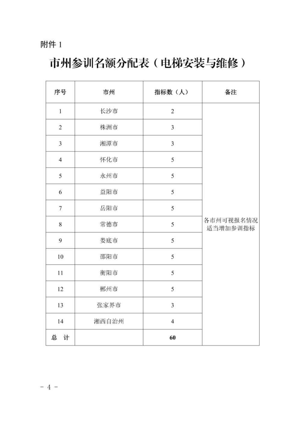 各市州水库移民机构: 根据年度移民培训工作计划,我中心委托湖南湘江工贸技工学校举办一期水库移民电梯安装与维修技能培训班。现就有关事项通知如下: 一、报到时间及地点 2024年6月30日在湖南湘江工贸技工学校电梯培训基地报到。 二、培训对象及名额分配 培训对象为 18周岁至45 周岁,身体健康且有明确就业创业意愿的大中型水库农村移民。本期计划培训 60 人。 三、培训内容、时间及方式 培训内容为电梯电子电工、电梯井道识图基础、电梯机械原理、电梯电路电控、电梯安装、维修及调试技术等。培训时间为在校学习 60 天。培训采取理论学习与实操训练相结合的方式进行。培训期满由培训机构统一组织学员参加考核,考核合格者可获得湖南省市场监督管理局特种设备作业人员资格证。 四、就业方式 学员结业获证后,可由学校推荐到全国各地电梯厂、大中型电梯公司(如奥立迅电梯公司、上海恒翔电梯公司、奥迪斯电梯公司、三菱电梯公司、升华电梯公司、通力电梯公司) 就业,实习期间(3 个月)企业待遇为每月 4500-5000 元,工作半年左右(含3个月实习期)月薪可达 6000-12000 元,也可自主择业。 五、培训费用 学员学习期间培训费、住宿费、考证费、床上用品费、保险费、实训与考试交通费等由我中心统一安排,学员生活费及参训往返交通费自理(学员按实际参训出勤率可享受每人每天30 元生活补助),学员需自付部分考证费用(每人380 元)。 六、有关要求 1.各市州、县市区水库移民机构要做好培训工作的宣传发动及相关保障,严格审核移民身份和健康状况,有序组织好有相应就业创业愿望的移民参加培训,并于 2024年6月24 日前,将汇总后的参训人员名单(见附件2) 报省我中心后期扶持部(联系人:周继征:报名咨询申话:0731-85495194;报名咨询时间:工作日上午 8:00-12:00,下午14:30-17:30;电子邮箱: hnympx2008@163.com)。 2.我中心将视报名情况对市州培训名额进行相应调整,并将生源输送任务完成情况作为绩效评价的重要依据 3.学员报到时需携带经当地水库移民机构盖章的《学员登记表》(见附件 3)、本人身份证、一寸免冠白底相片2 张、两寸免冠白底相片2 张 附件: 1.市州参训名额分配表 (电梯安装与维修) 2.市州移民技能培训报名表 3.库区移民转移就业技能培训学员登记表 4.学校地址、到校路线及联系人