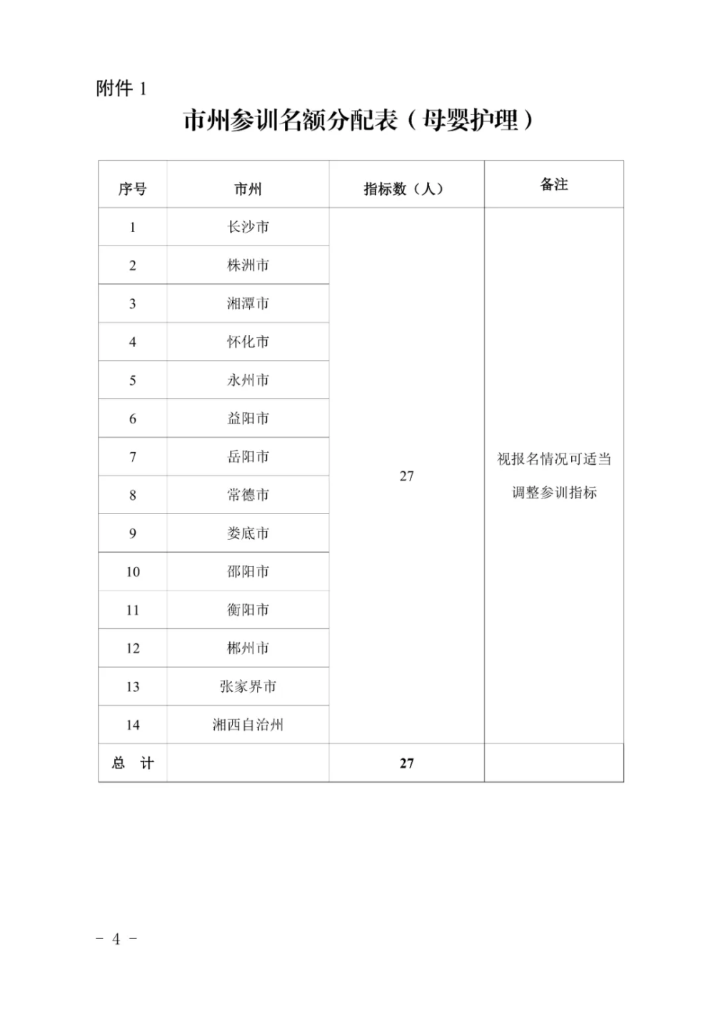 各市州水库移民机构: 根据年度移民培训工作计划,我中心委托湖南省妇幼馨月母婴服务培训中心举办2024年第三期水库移民母婴护理员培训班现就有关事项通知如下: 一、报到时间及地点 2024年12月1日在湖南省妇幼保健院(长沙市开福区湘春路53号)诚信楼二楼 207房间报到。 二、培训对象及名额分配 培训对象为25周岁至50周岁,身体健康且有明确就业意愿的大中型水库农村女性移民。计划培训27人。 三、培训内容、时间及方式 母婴护理员的职业道德与行为规范、新生儿日常观察与护理、科学坐月子、母乳喂养技巧、新生儿沐浴、抚触及操作、新生儿常见疾病的早期识别和治疗、0-3月婴儿意外伤害的预防与家庭护理、剖官产术后护理及母婴同室月嫂服务工作细则、0-3岁婴幼儿保健及育婴知识要点、产后康复操等。培训时间15天,其中理论学习5天,实习8天,考证2天。培训采用“专家理论教学+模拟实操+产科病房实习”的模式进行。培训期满,由培训机构统一组织学员参加考试,考试合格者可获得湖南省妇幼馨月母婴服务培训中心颁发的母婴护理员专业培训合格证以及湖南省育婴师协会颁发的育婴员五级职业技能等级证书。 四、就业方式 考试合格学员可推荐安排上岗工作, 五、培训费用 学员学习期间培训费、学杂费、住宿费、考证费、保险费体检费、服装费等由我中心统一安排,学员生活费及参训往返交通费自理(按实际参训出勤率可享受每人每天30元生活补助)。 六、有关要求 1.各市州水库移民机构要做好培训工作的宣传发动及相关保障,严格审核移民身份和健康状况,有序组织有相应就业创业意愿的移民参加培训,并于2024年11月27日前将汇总后的参训人员名单(见附件2)报我中心后期扶持部(联系人:周征;报名咨询电话:0731-85495194,报名咨询时间:工作日上午8:00-12:00,下午14:30-17:30;电子邮箱:hnympx2008@163.com)。我中心将视报名情况对培训名额进行相应调整。 2.学员报到时需携带经当地水库移民机构盖章的《学员登记表》( 见附件 3)、本人身份证、一寸免冠白底近照4张。 附件:1.市州参训名额分配表(母婴护理) 2.市州移民技能培训报名表 3.库区移民转移就业技能培训学员登记表 4.学校地址、到校路线及联系电话